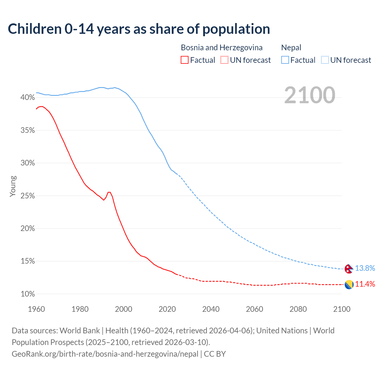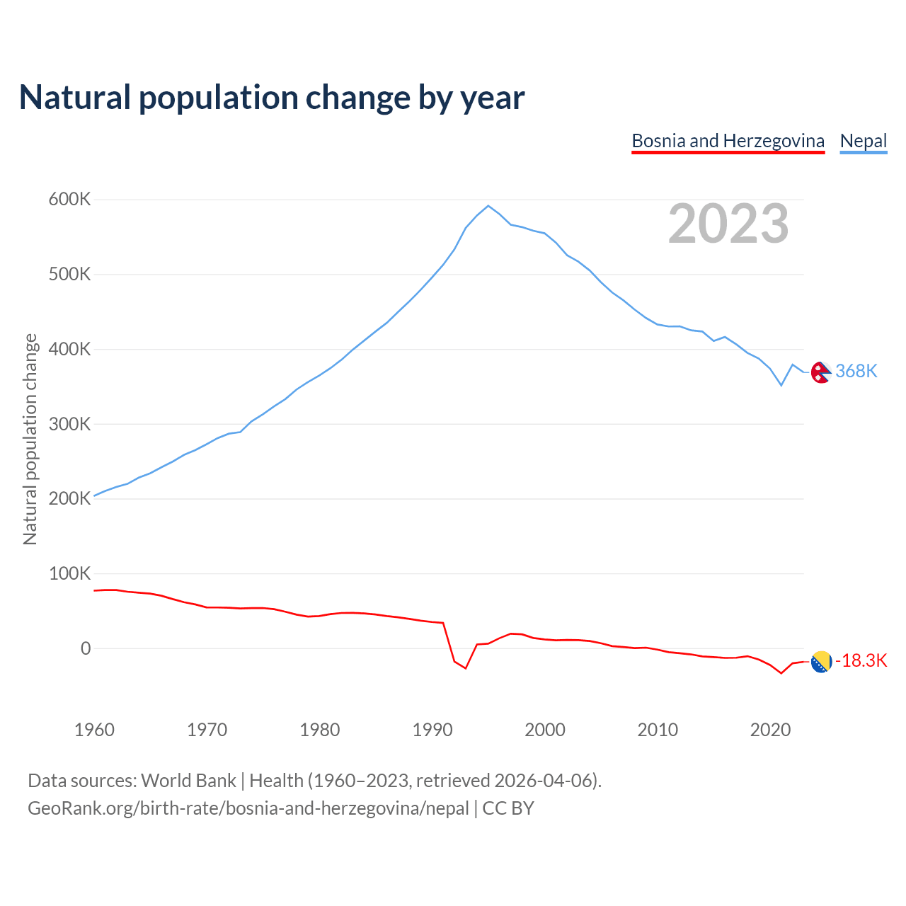 Bosnia and Herzegovina has an annual birth rate of 7.71 births per 1,000 people, compared to 19.3 for Nepal. The average number of children a woman is expected to have during her lifetime — the fertility rate, is 1.49 in Bosnia and Herzegovina and 1.98 in Nepal — 33.5% difference.