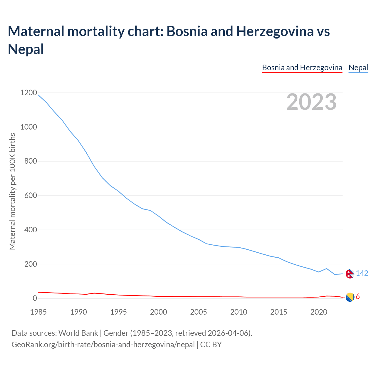 The maternal mortality rate, which is the probability of dying during childbirth or within 42 days of pregnancy termination, is 6 deaths per 100,000 live births in Bosnia and Herzegovina, compared to 142 deaths in Nepal.