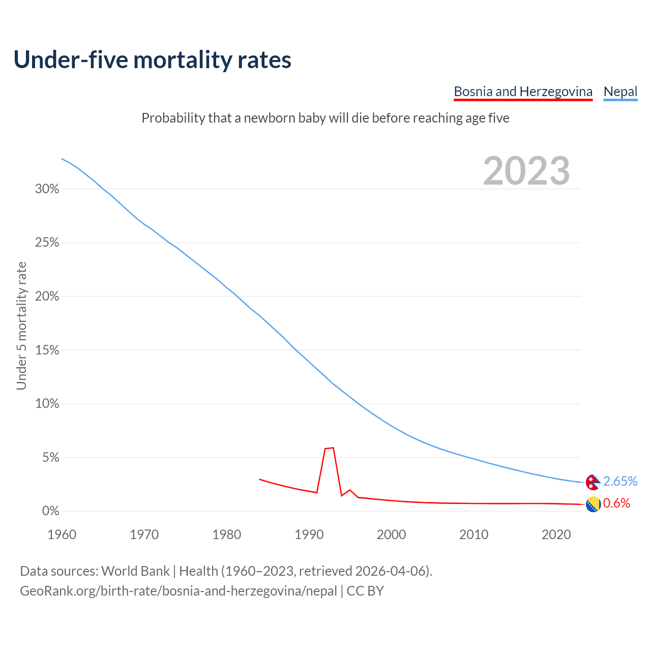 The chance that a newborn baby will die before reaching age five is 0.6% in Bosnia and Herzegovina and 2.65% in Nepal. Above is a chart with historical data on under-five mortality rates.