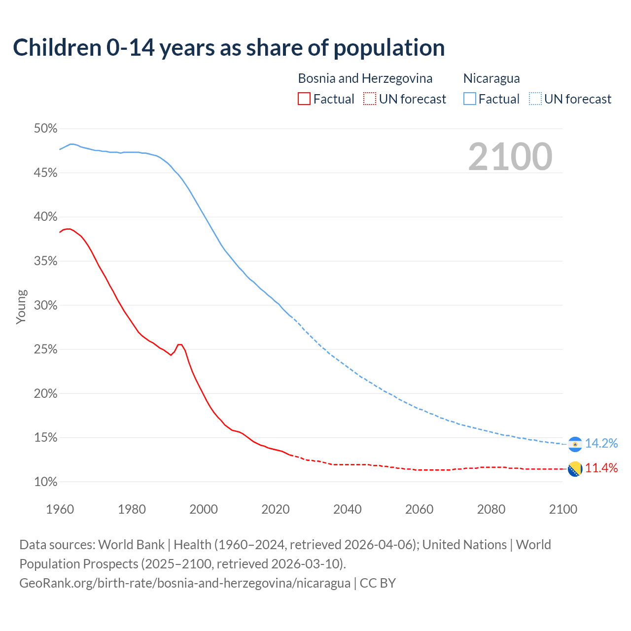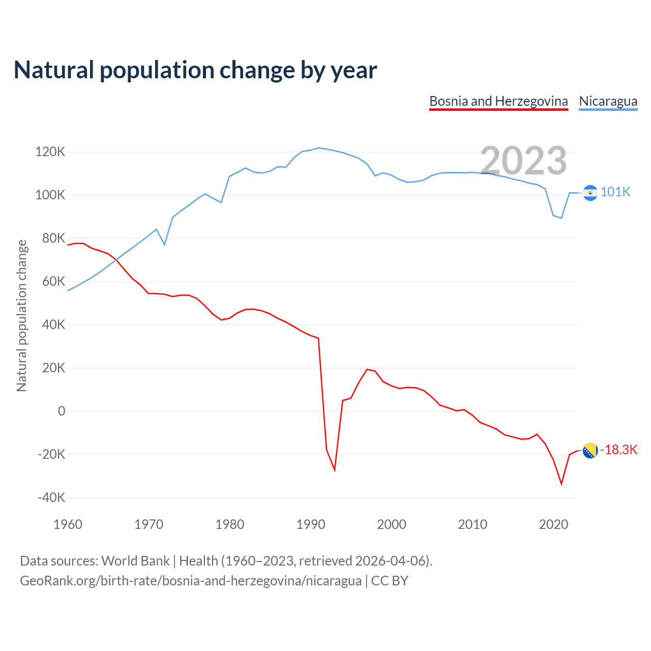 According to the latest available data on birth rates, the fertility rate in Bosnia and Herzegovina was 1.49 children per woman in 2023, compared to 2.22 in Nicaragua in 2023. The replacement level is considered to be 2.1 children per woman.