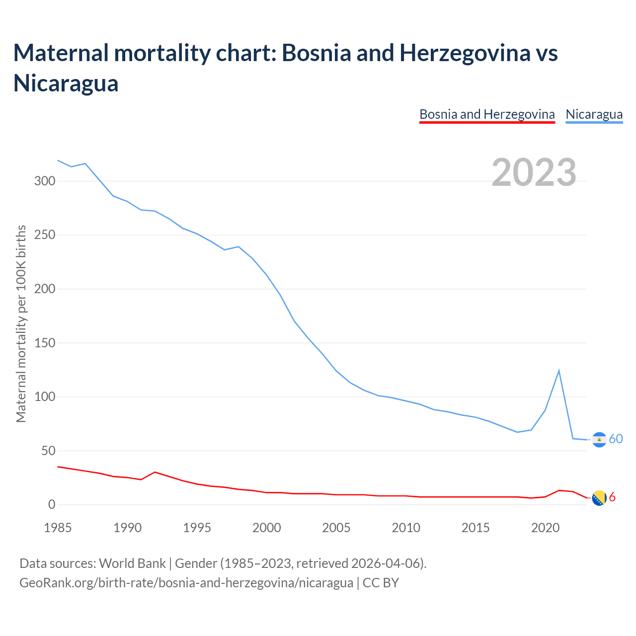 The maternal mortality rate, which is the probability of dying during childbirth or within 42 days of pregnancy termination, is 6 deaths per 100,000 live births in Bosnia and Herzegovina, compared to 60 deaths in Nicaragua.