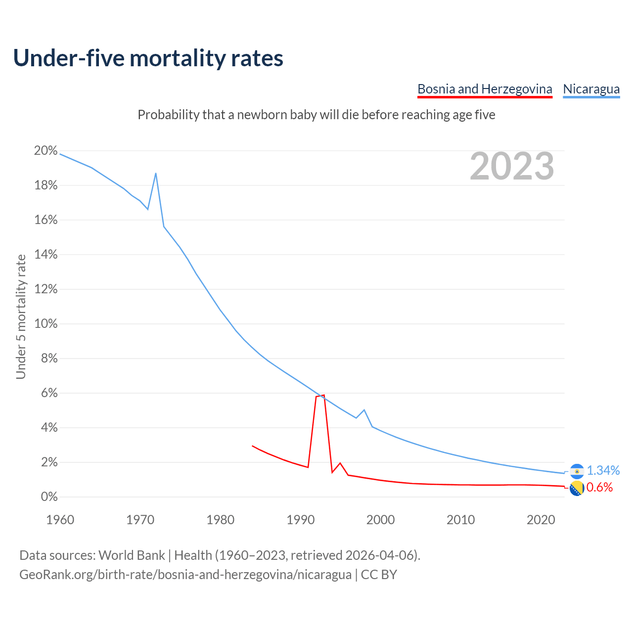 The chance that a newborn baby will die before reaching age five is 0.6% in Bosnia and Herzegovina and 1.34% in Nicaragua. Above is a chart with historical data on under-five mortality rates.