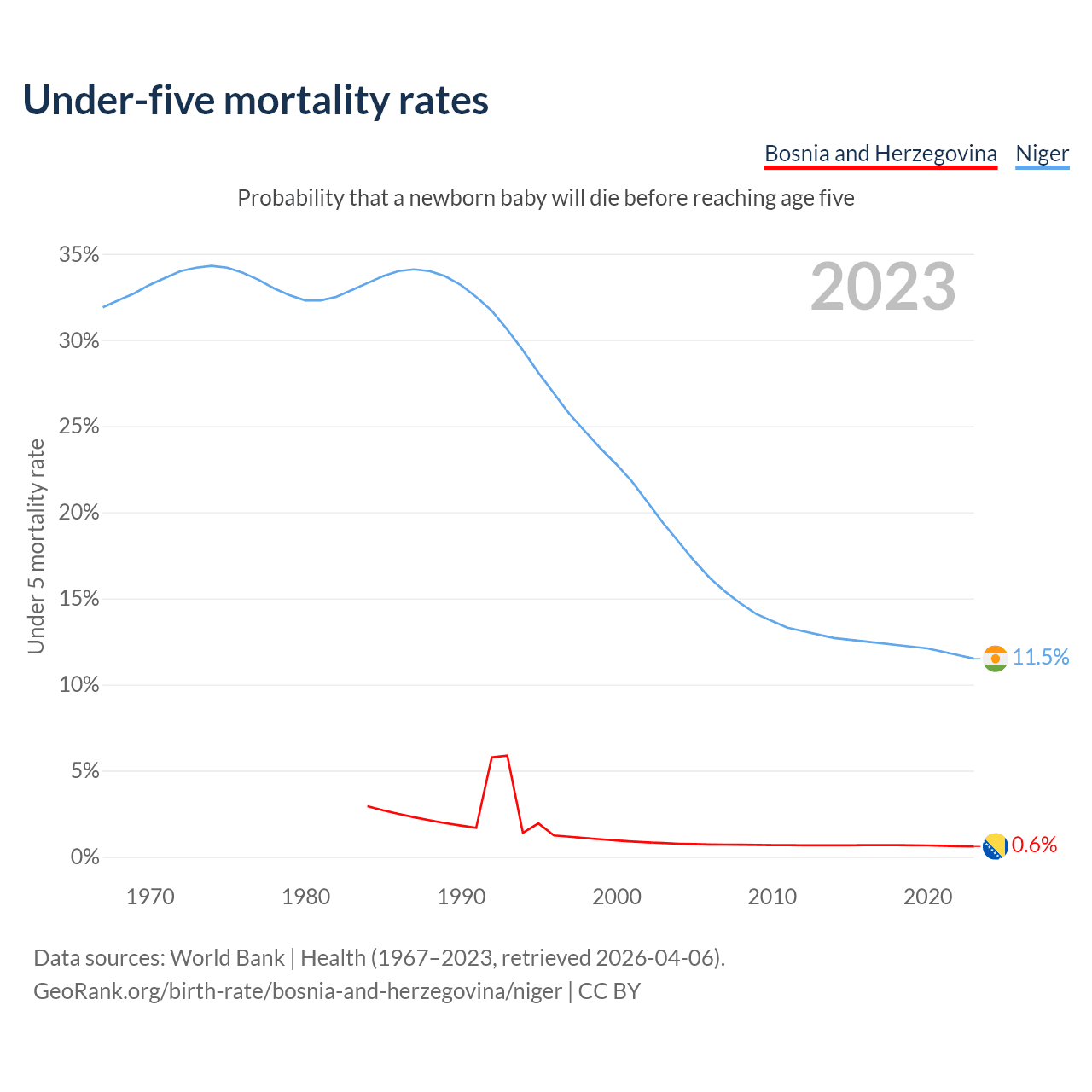 The chance that a newborn baby will die before reaching age five is 0.6% in Bosnia and Herzegovina and 11.5% in Niger. Above is a chart with historical data on under-five mortality rates.