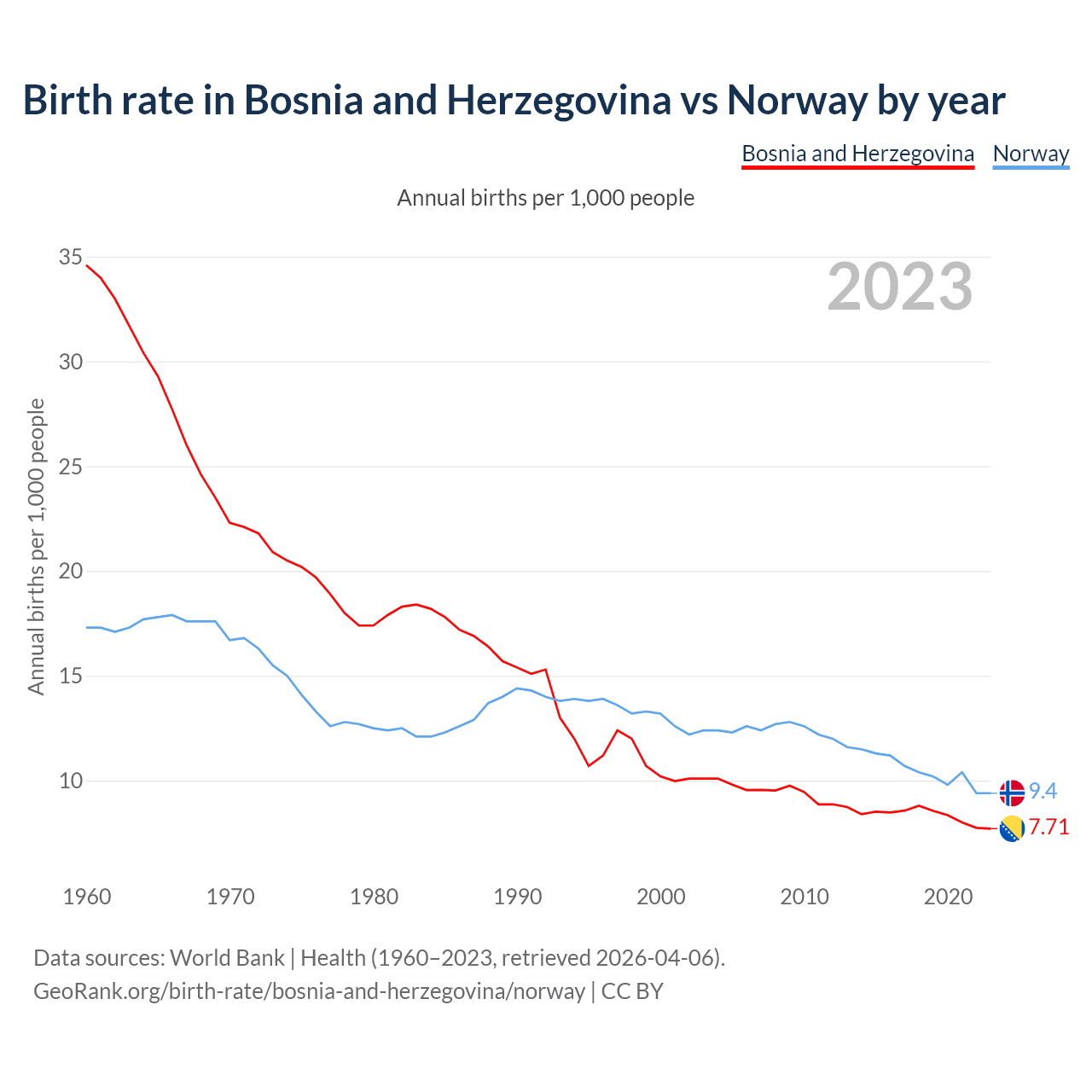 Bosnia and Herzegovina has an annual birth rate of 7.71 births per 1,000 people, compared to 9.4 for Norway. The average number of children a woman is expected to have during her lifetime — the fertility rate, is 1.49 in Bosnia and Herzegovina and 1.4 in Norway — 5.79% difference.