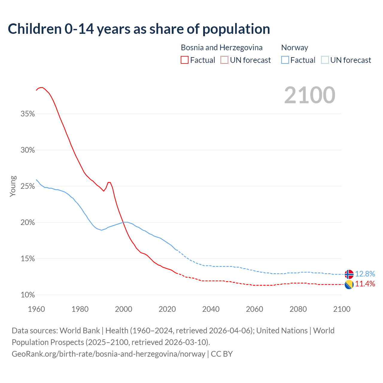 According to the latest available data on birth rates, the fertility rate in Bosnia and Herzegovina was 1.49 children per woman in 2023, compared to 1.4 in Norway in 2023. The replacement level is considered to be 2.1 children per woman.
