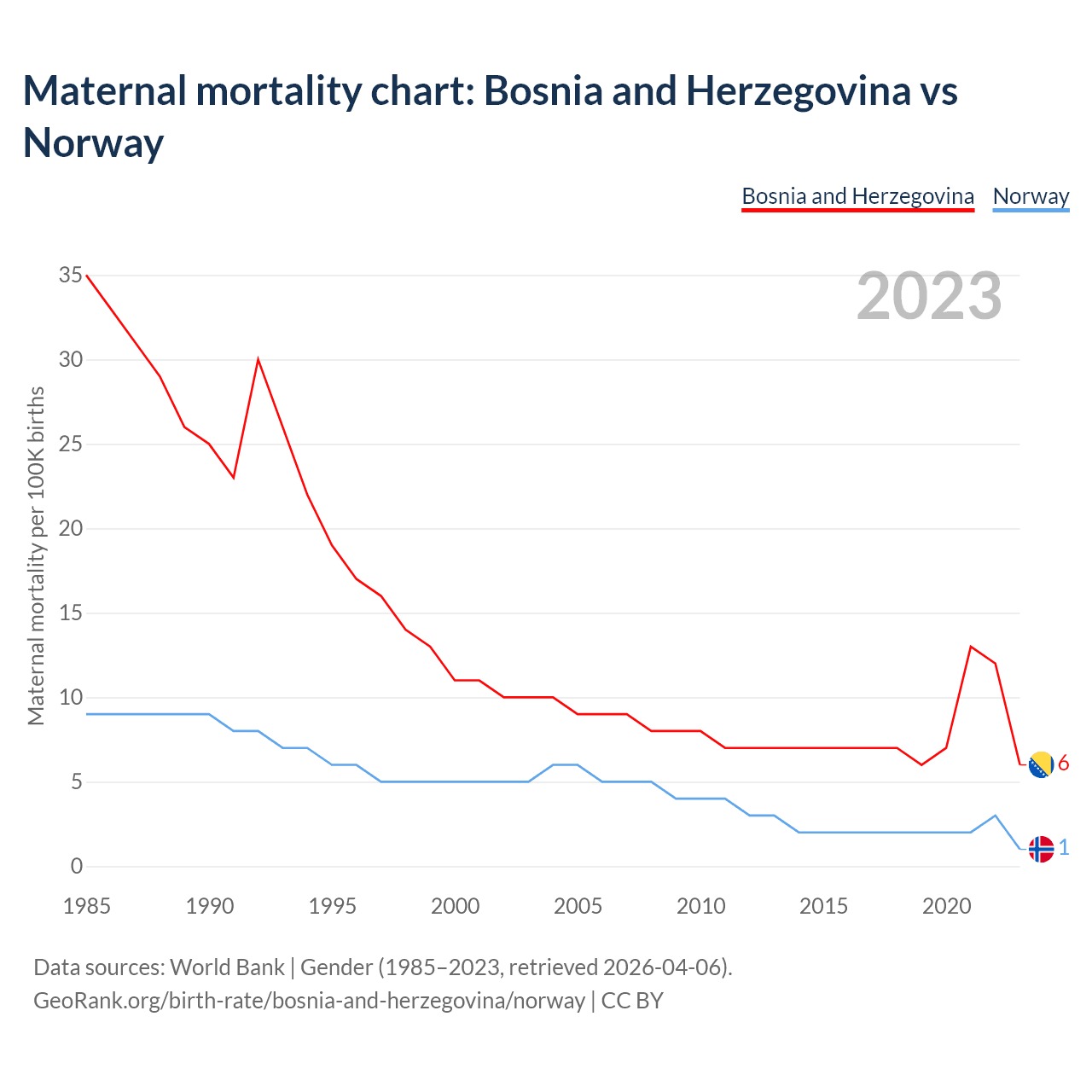 The maternal mortality rate, which is the probability of dying during childbirth or within 42 days of pregnancy termination, is 6 deaths per 100,000 live births in Bosnia and Herzegovina, compared to 1 deaths in Norway.