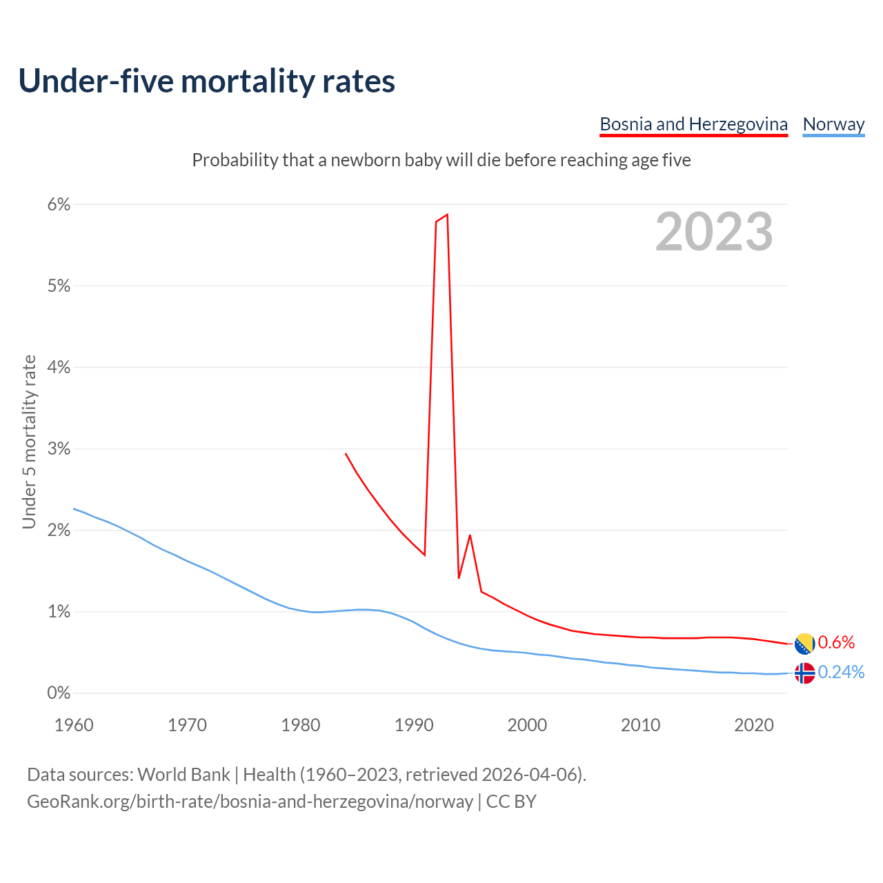 The chance that a newborn baby will die before reaching age five is 0.6% in Bosnia and Herzegovina and 0.24% in Norway. Above is a chart with historical data on under-five mortality rates.