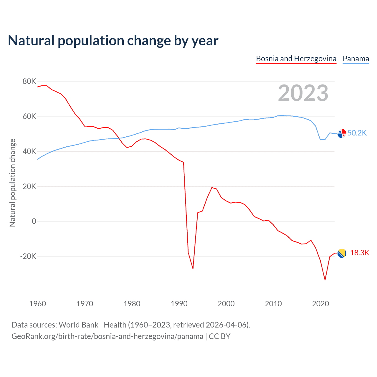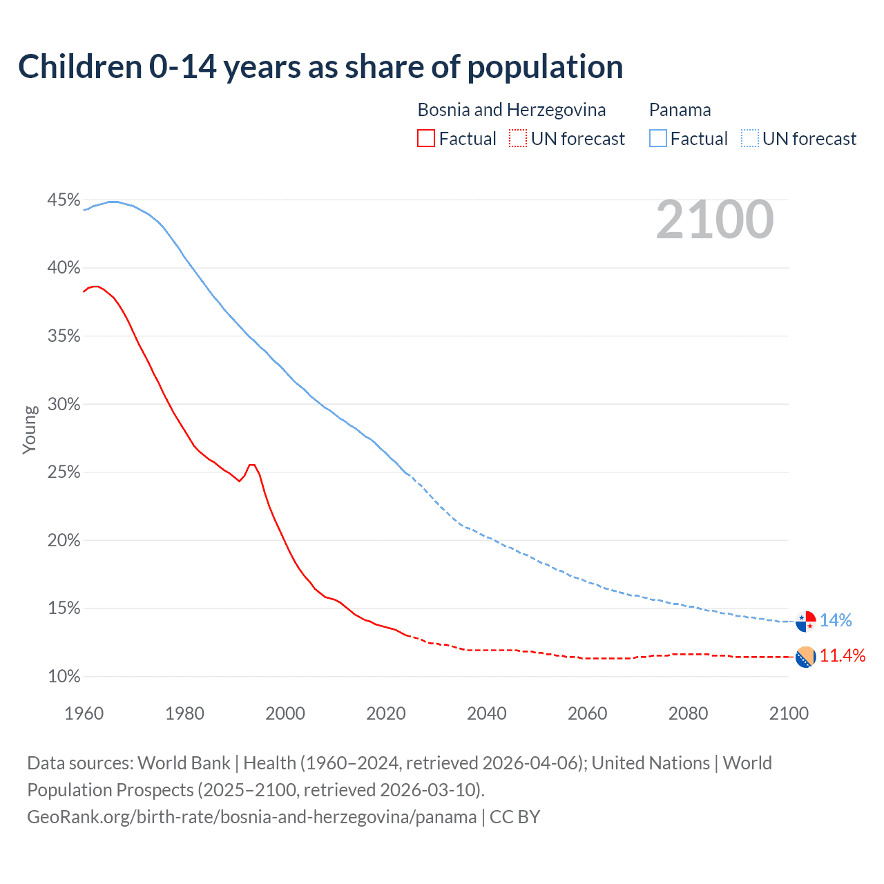 According to the latest available data on birth rates, the fertility rate in Bosnia and Herzegovina was 1.49 children per woman in 2023, compared to 2.12 in Panama in 2023. The replacement level is considered to be 2.1 children per woman.