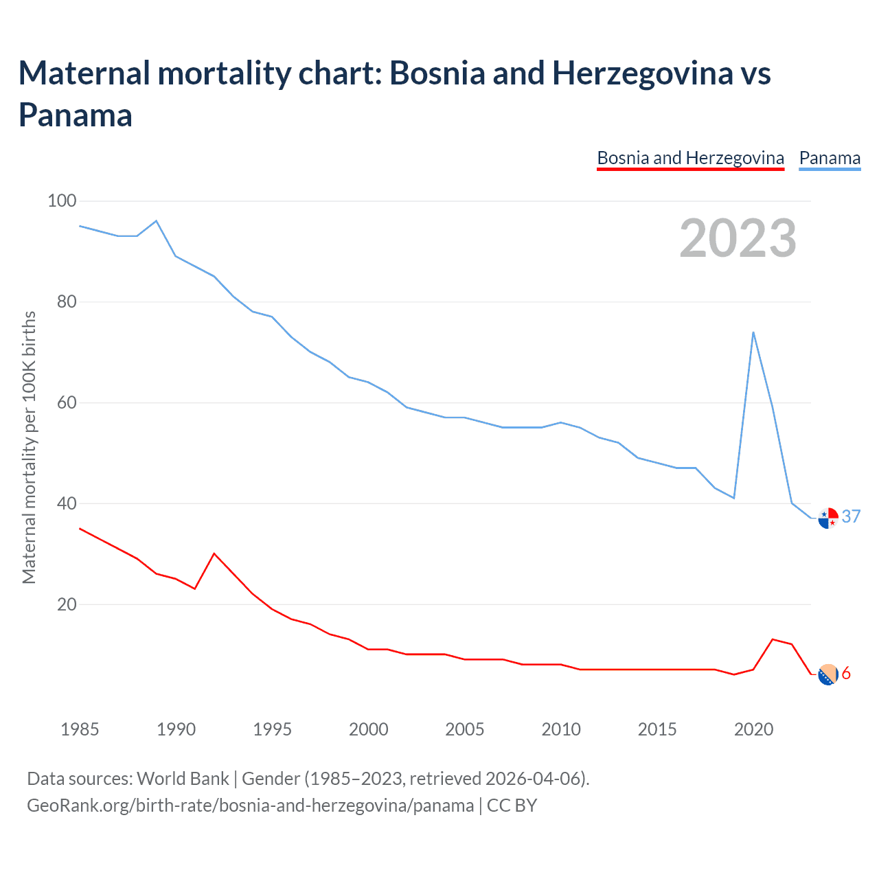 The maternal mortality rate, which is the probability of dying during childbirth or within 42 days of pregnancy termination, is 6 deaths per 100,000 live births in Bosnia and Herzegovina, compared to 37 deaths in Panama.