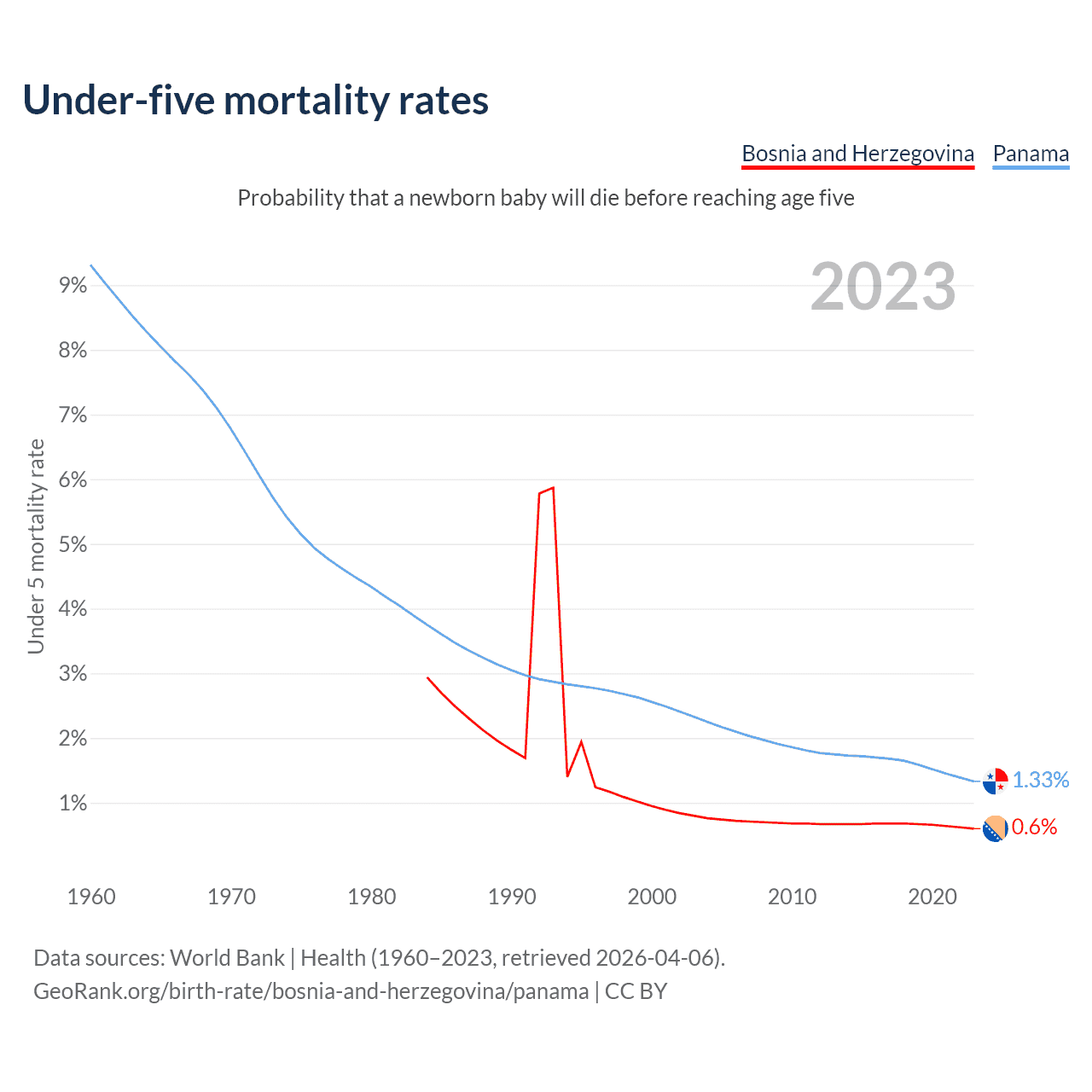 The chance that a newborn baby will die before reaching age five is 0.6% in Bosnia and Herzegovina and 1.33% in Panama. Above is a chart with historical data on under-five mortality rates.