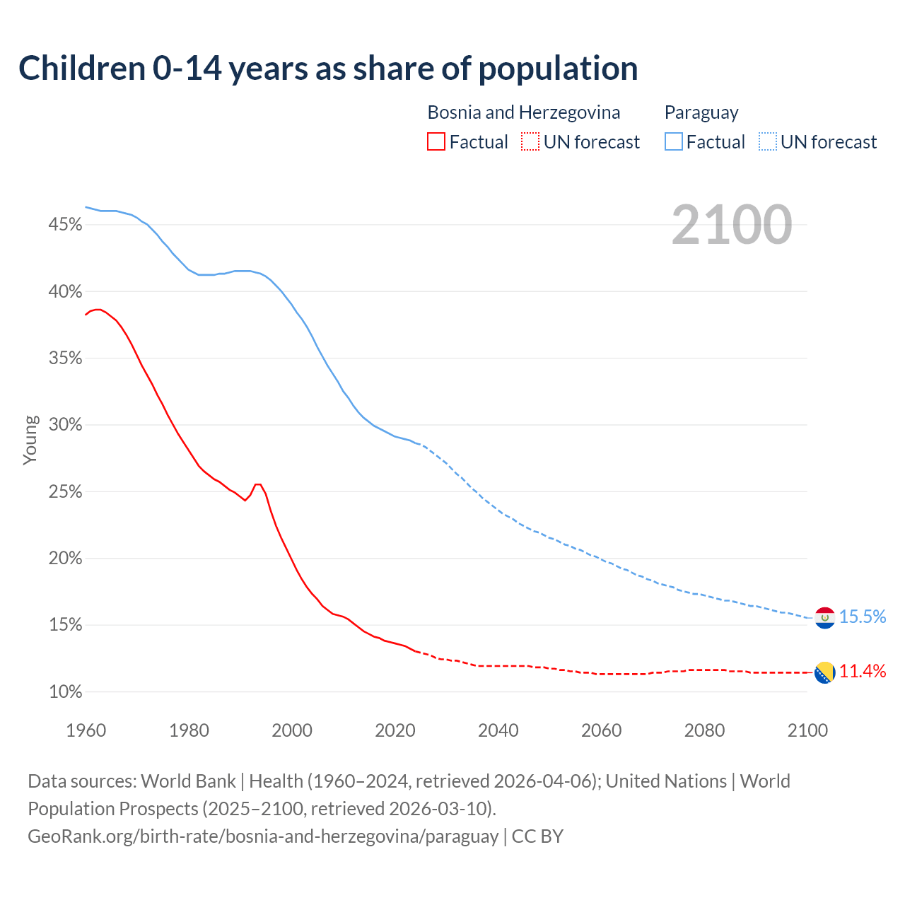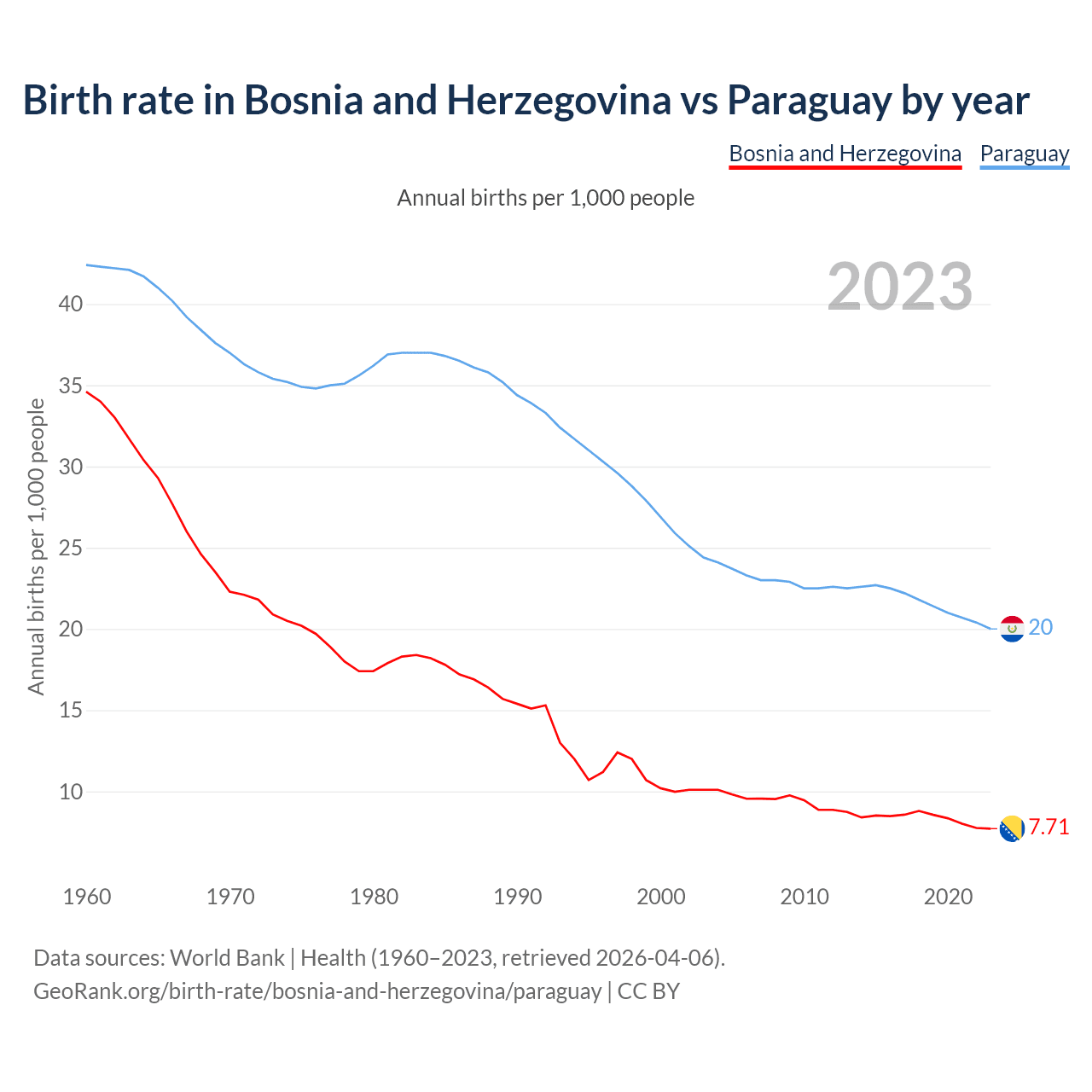 Bosnia and Herzegovina has an annual birth rate of 7.71 births per 1,000 people, compared to 20 for Paraguay. The average number of children a woman is expected to have during her lifetime — the fertility rate, is 1.49 in Bosnia and Herzegovina and 2.42 in Paraguay — 63% difference.