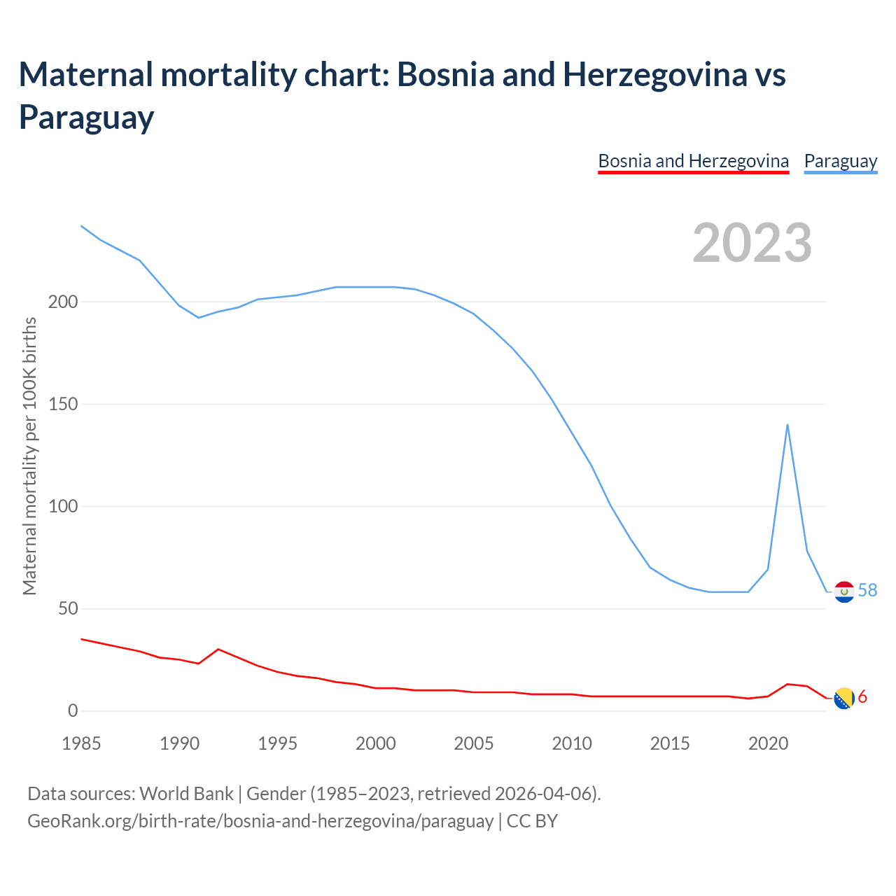The maternal mortality rate, which is the probability of dying during childbirth or within 42 days of pregnancy termination, is 6 deaths per 100,000 live births in Bosnia and Herzegovina, compared to 58 deaths in Paraguay.