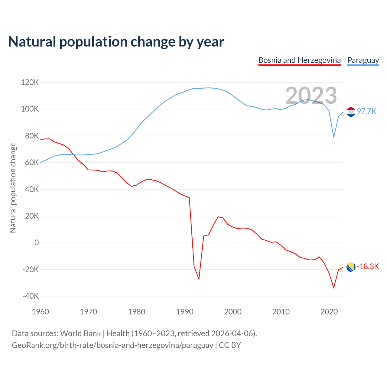 According to the latest available data on birth rates, the fertility rate in Bosnia and Herzegovina was 1.49 children per woman in 2023, compared to 2.42 in Paraguay in 2023. The replacement level is considered to be 2.1 children per woman.
