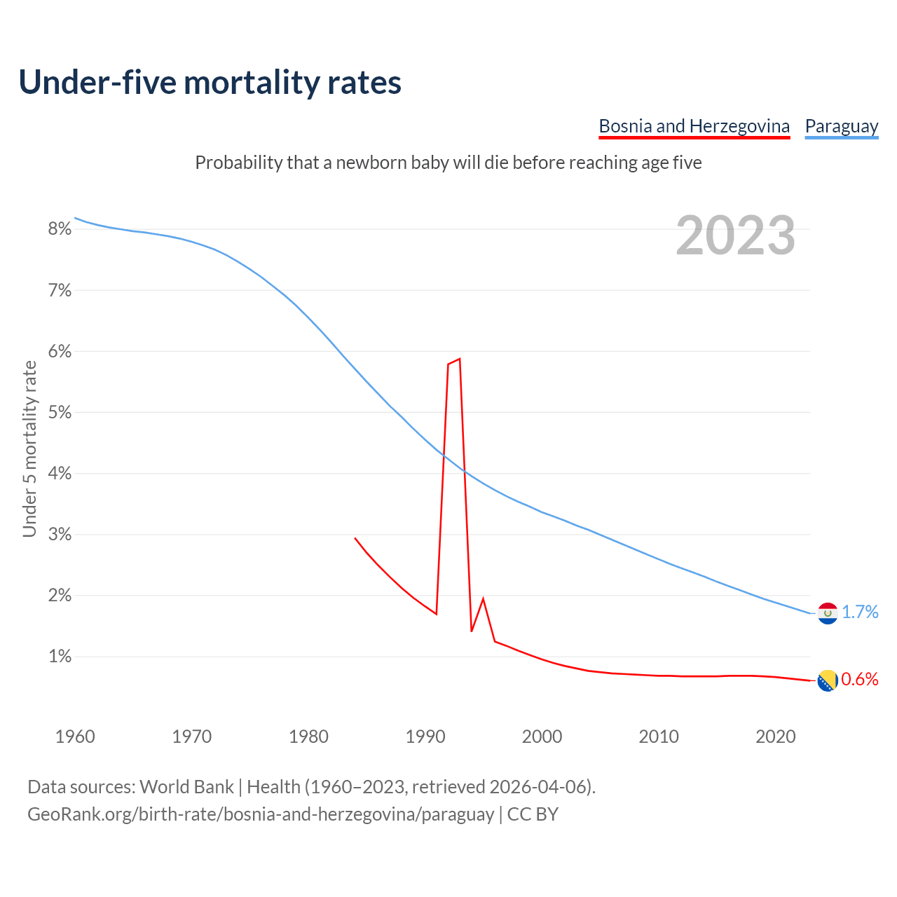 The chance that a newborn baby will die before reaching age five is 0.6% in Bosnia and Herzegovina and 1.7% in Paraguay. Above is a chart with historical data on under-five mortality rates.