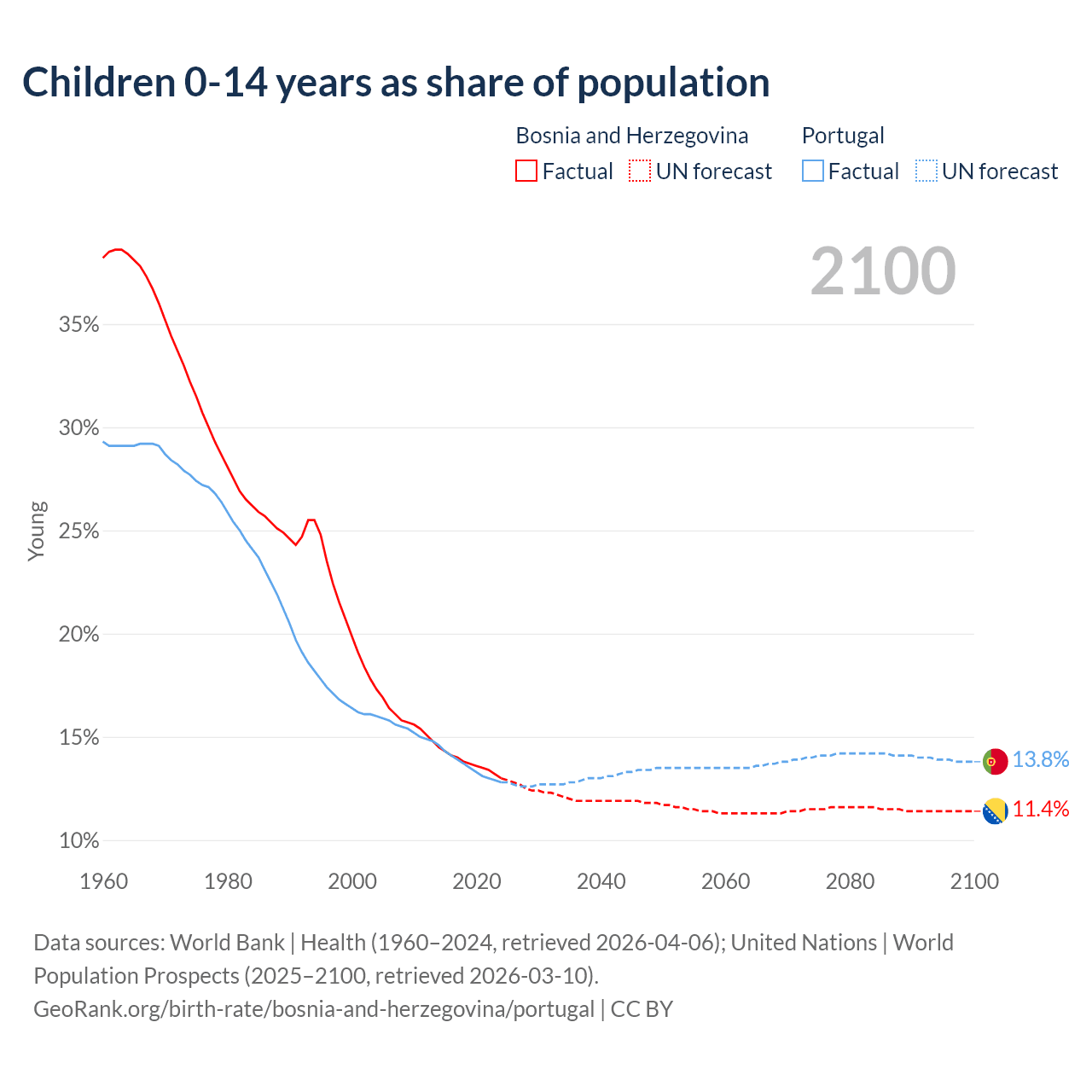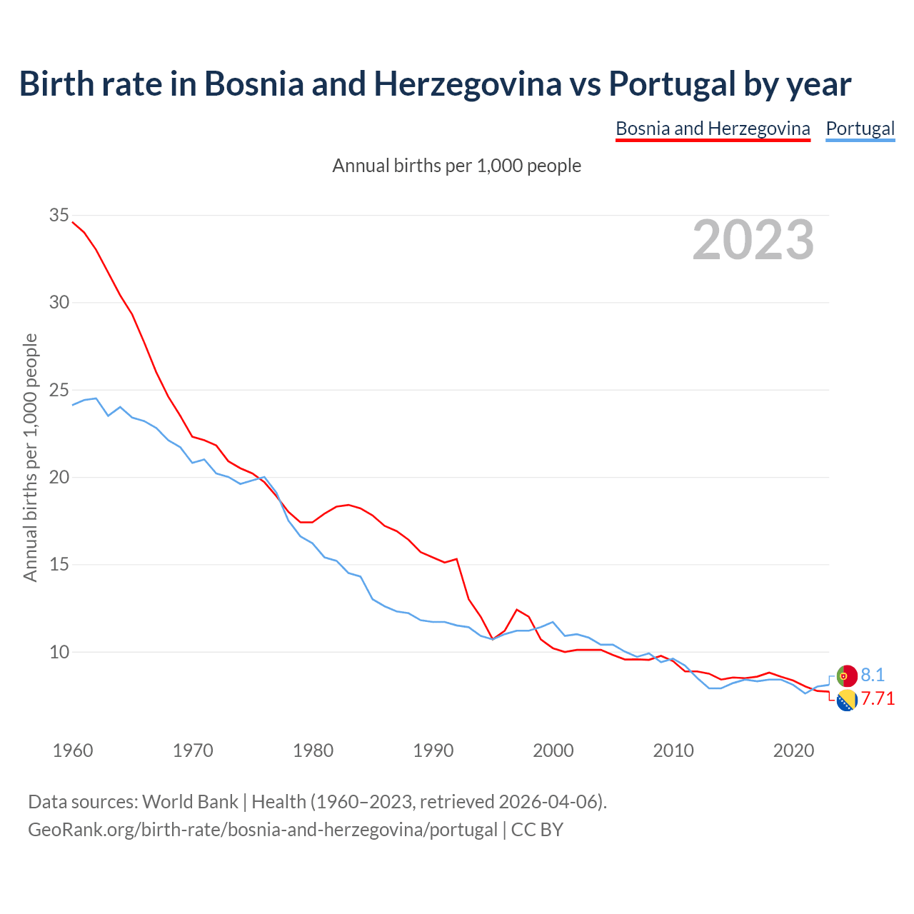 Bosnia and Herzegovina has an annual birth rate of 7.71 births per 1,000 people, compared to 8.1 for Portugal. The average number of children a woman is expected to have during her lifetime — the fertility rate, is 1.49 in Bosnia and Herzegovina and 1.44 in Portugal — 3.1% difference.