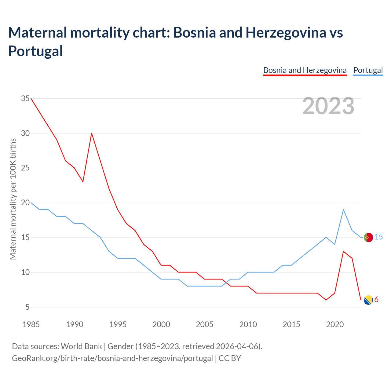 The maternal mortality rate, which is the probability of dying during childbirth or within 42 days of pregnancy termination, is 6 deaths per 100,000 live births in Bosnia and Herzegovina, compared to 15 deaths in Portugal.