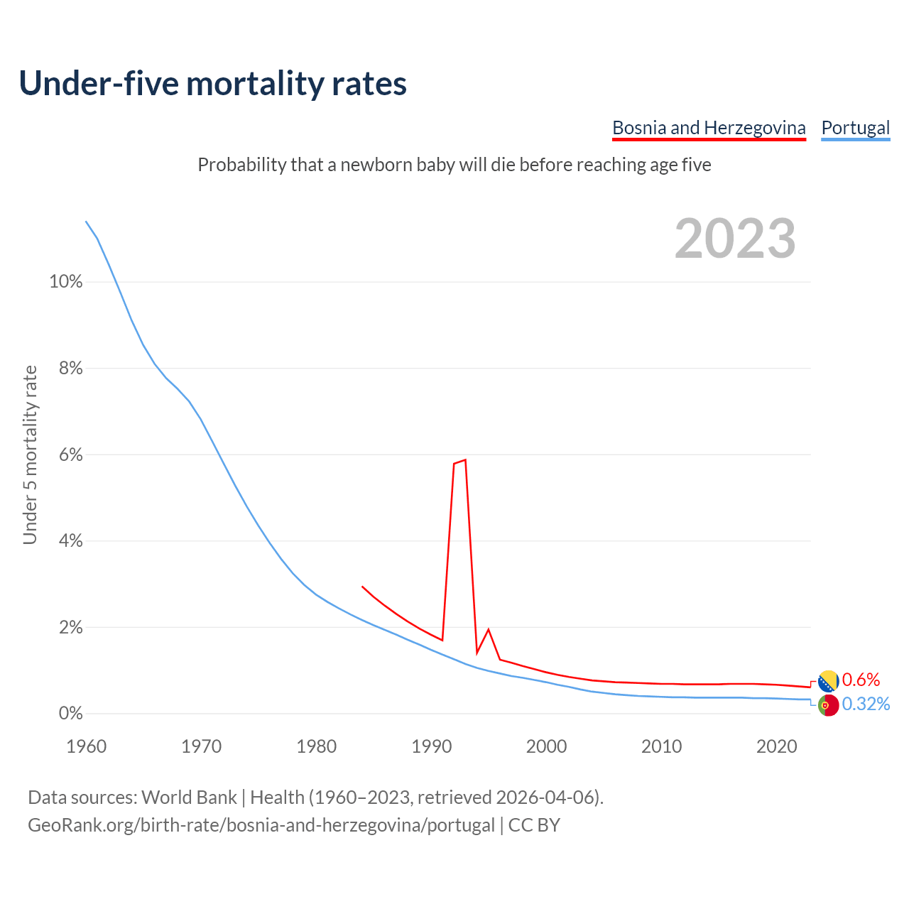 The chance that a newborn baby will die before reaching age five is 0.6% in Bosnia and Herzegovina and 0.32% in Portugal. Above is a chart with historical data on under-five mortality rates.