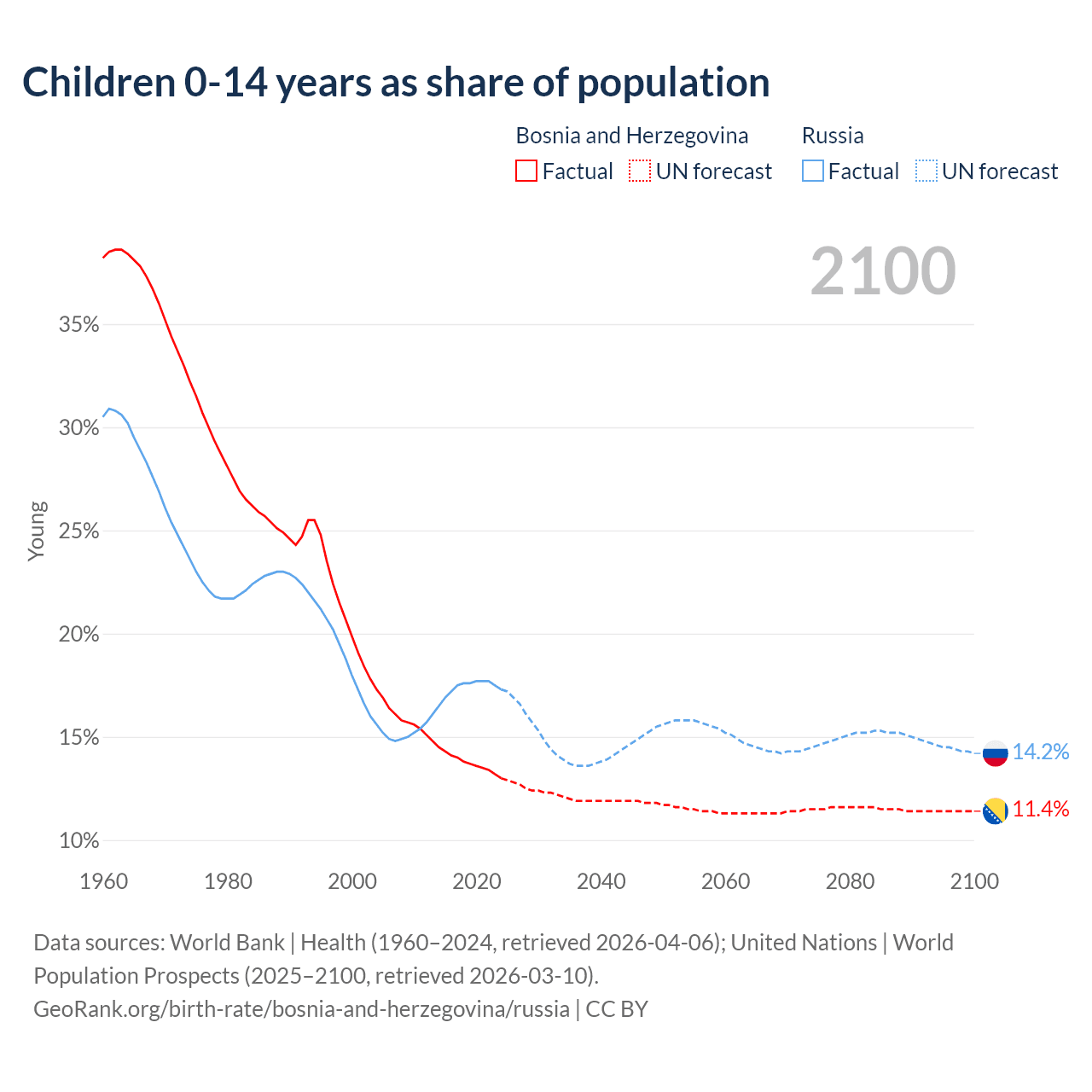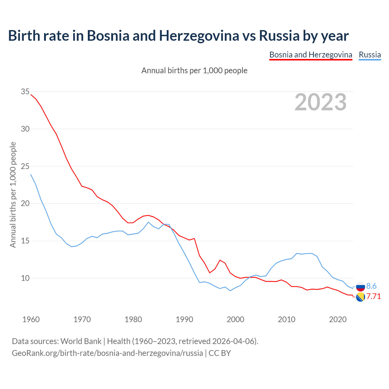 Bosnia and Herzegovina has an annual birth rate of 7.71 births per 1,000 people, compared to 8.6 for Russia. The average number of children a woman is expected to have during her lifetime — the fertility rate, is 1.49 in Bosnia and Herzegovina and 1.41 in Russia — 5.11% difference.