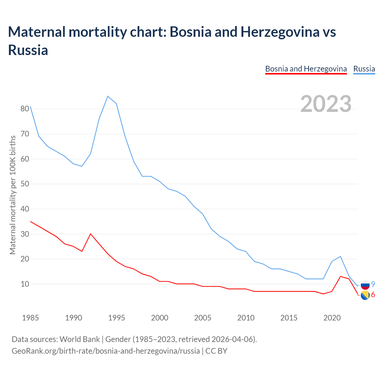 The maternal mortality rate, which is the probability of dying during childbirth or within 42 days of pregnancy termination, is 6 deaths per 100,000 live births in Bosnia and Herzegovina, compared to 9 deaths in Russia.