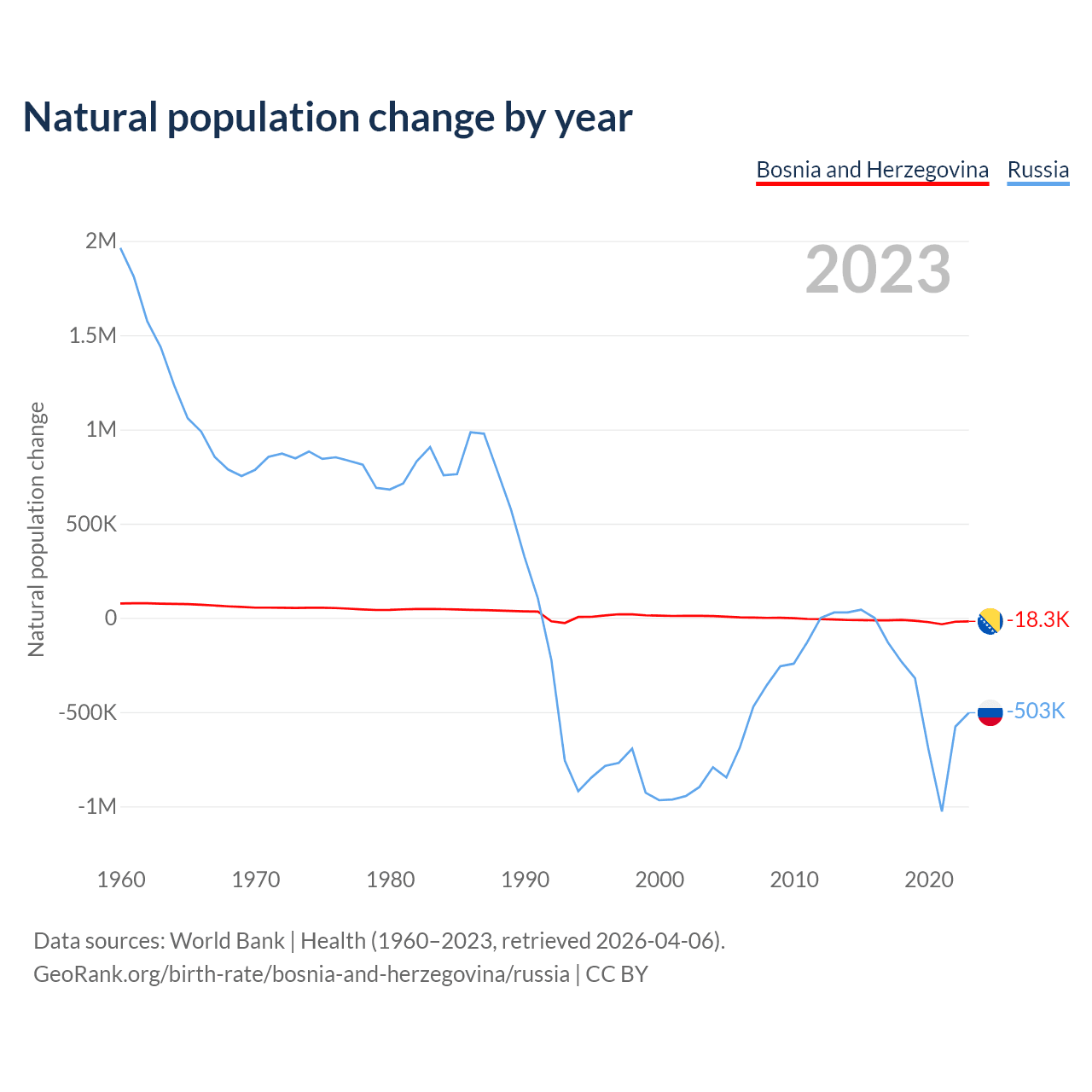 According to the latest available data on birth rates, the fertility rate in Bosnia and Herzegovina was 1.49 children per woman in 2023, compared to 1.41 in Russia in 2023. The replacement level is considered to be 2.1 children per woman.