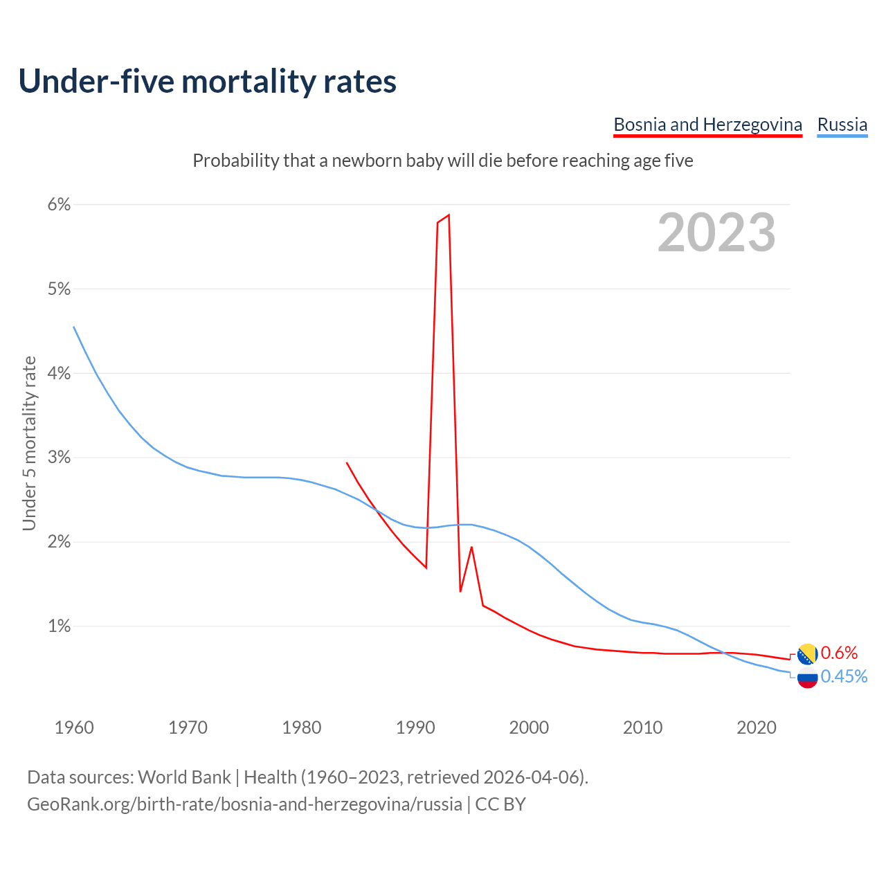 The chance that a newborn baby will die before reaching age five is 0.6% in Bosnia and Herzegovina and 0.45% in Russia. Above is a chart with historical data on under-five mortality rates.