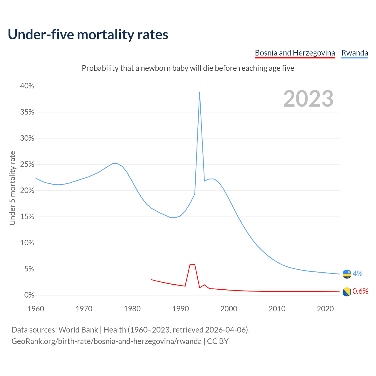 The chance that a newborn baby will die before reaching age five is 0.6% in Bosnia and Herzegovina and 4% in Rwanda. Above is a chart with historical data on under-five mortality rates.