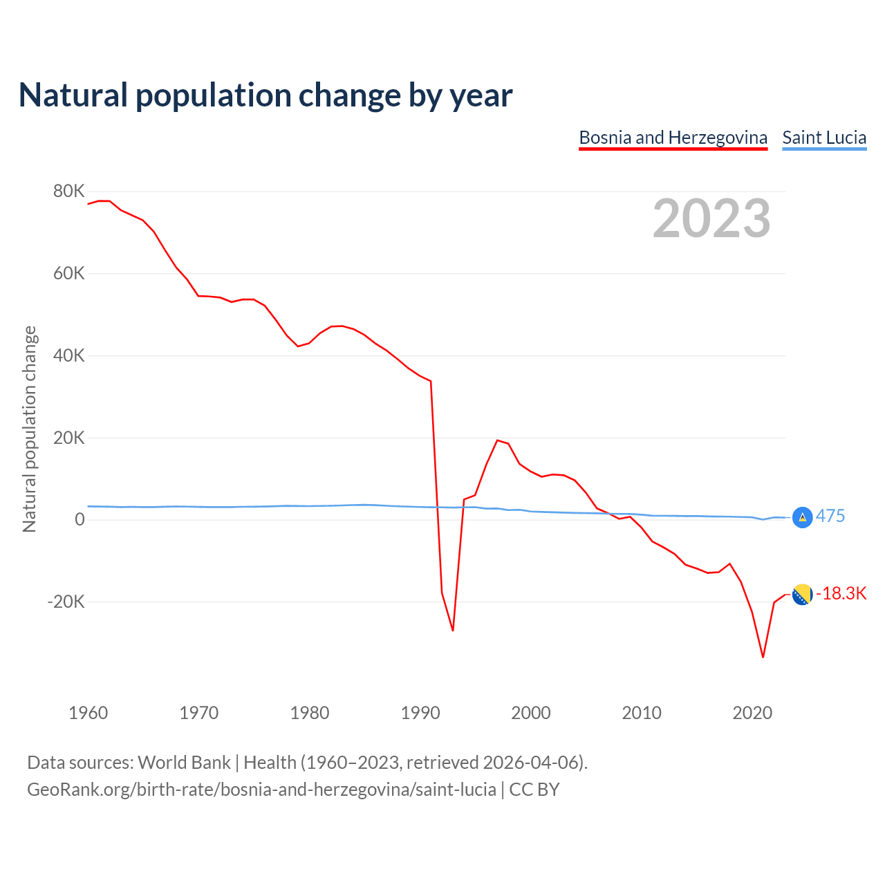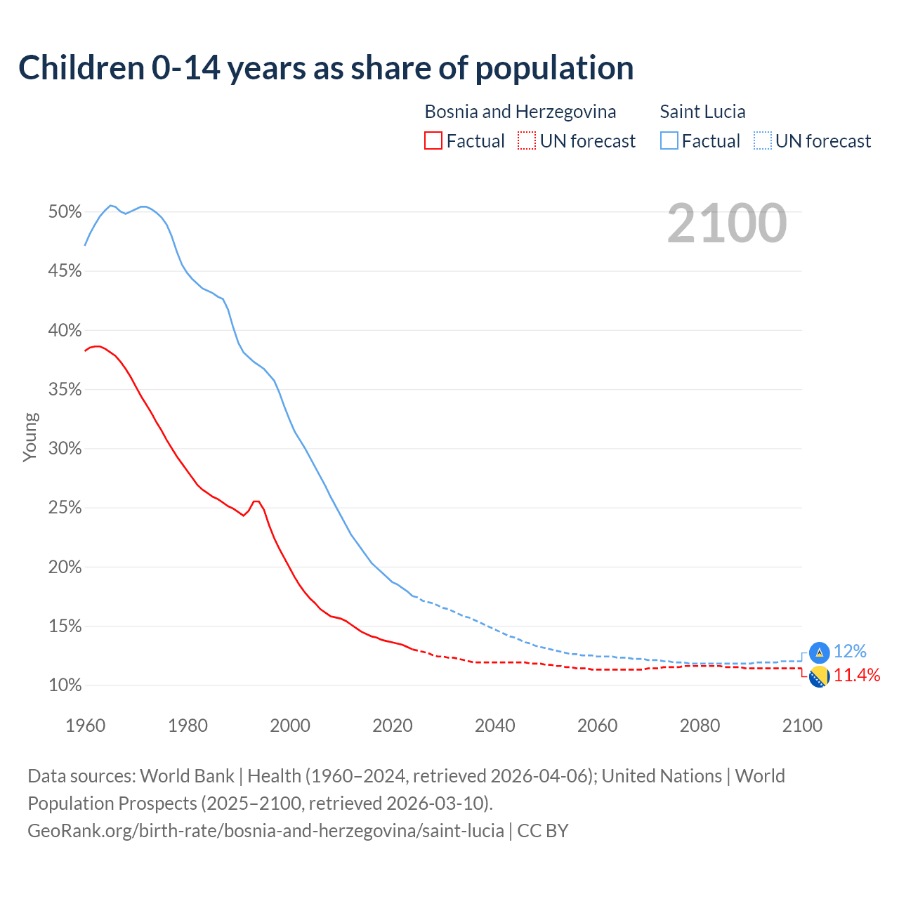 According to the latest available data on birth rates, the fertility rate in Bosnia and Herzegovina was 1.49 children per woman in 2023, compared to 1.38 in Saint Lucia in 2023. The replacement level is considered to be 2.1 children per woman.