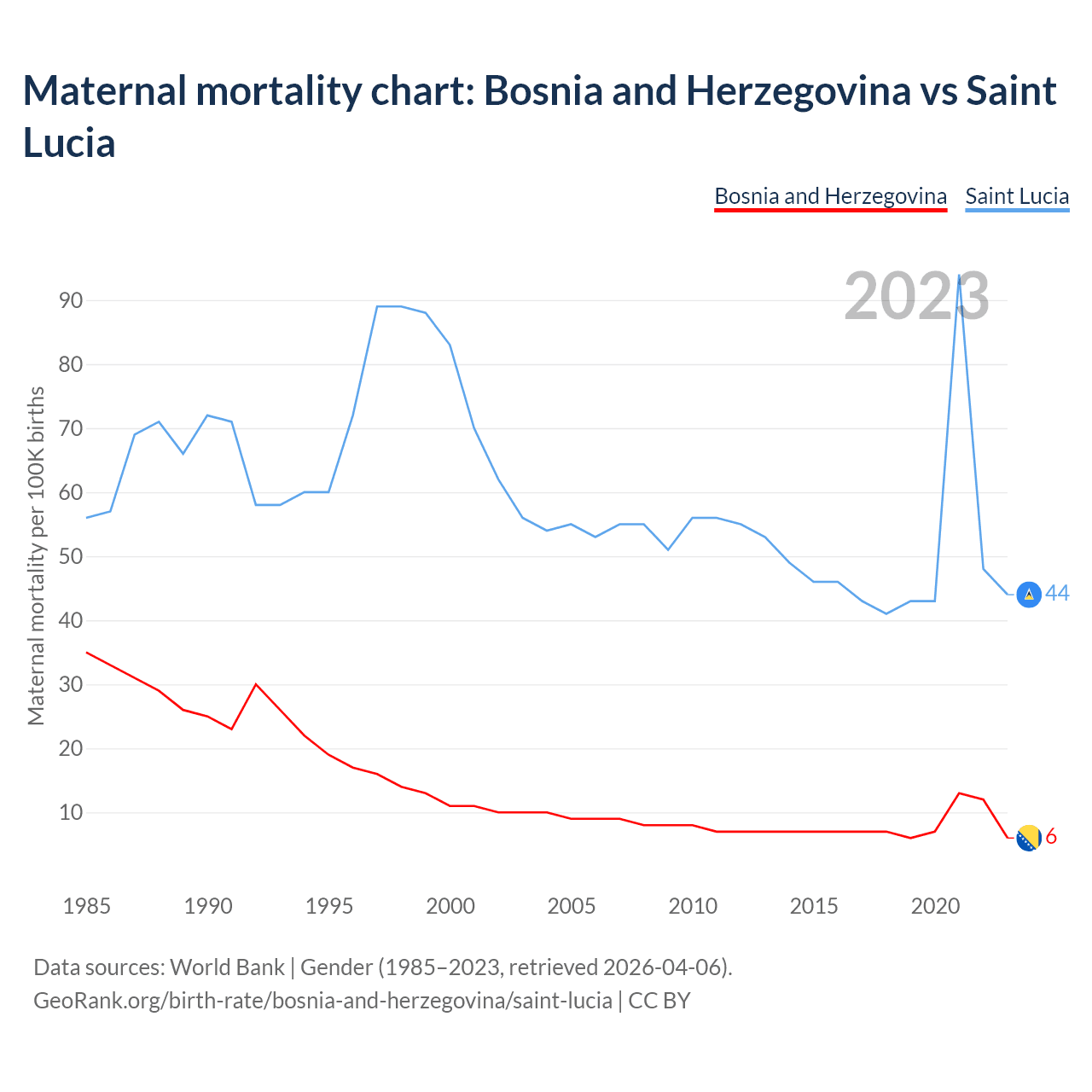 The maternal mortality rate, which is the probability of dying during childbirth or within 42 days of pregnancy termination, is 6 deaths per 100,000 live births in Bosnia and Herzegovina, compared to 44 deaths in Saint Lucia.