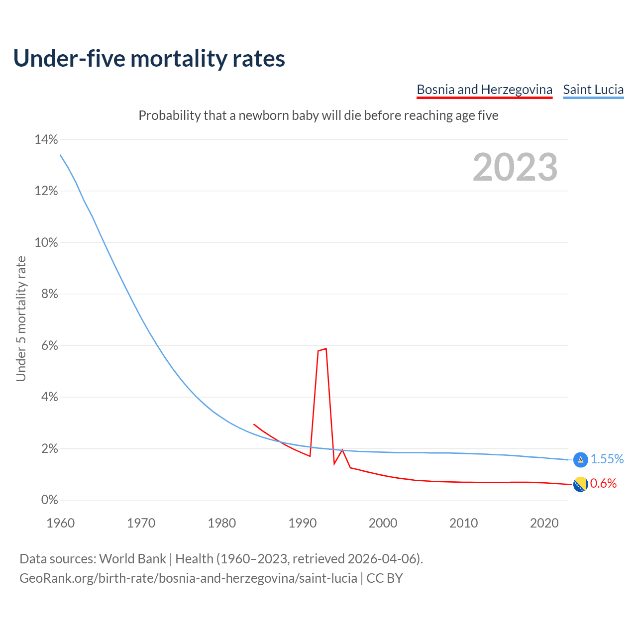 The chance that a newborn baby will die before reaching age five is 0.6% in Bosnia and Herzegovina and 1.55% in Saint Lucia. Above is a chart with historical data on under-five mortality rates.