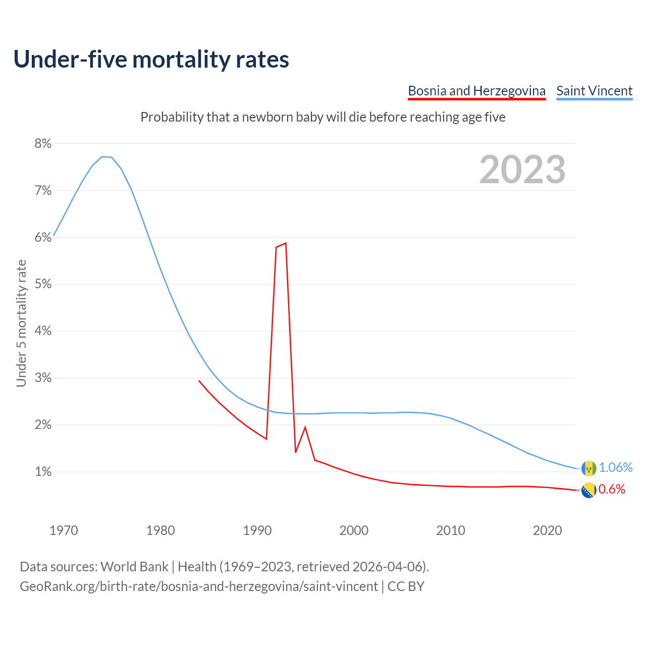 The chance that a newborn baby will die before reaching age five is 0.6% in Bosnia and Herzegovina and 1.06% in Saint Vincent. Above is a chart with historical data on under-five mortality rates.