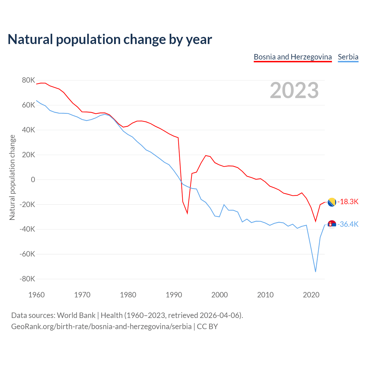 1960 vs 2023, the fertility rate has decreased by 62.5% in Bosnia and Herzegovina and by 25.3% in Serbia — in 1960, it was 3.96 and 2.15, respectively.