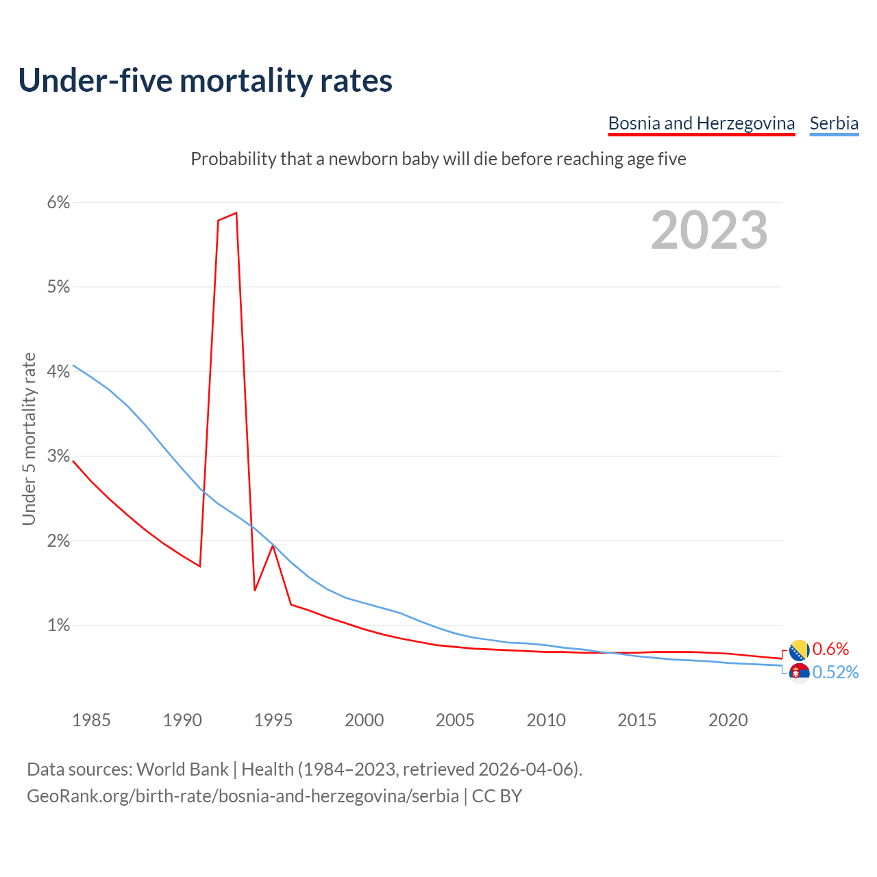 The chance that a newborn baby will die before reaching age five is 0.6% in Bosnia and Herzegovina and 0.52% in Serbia. Above is a chart with historical data on under-five mortality rates.