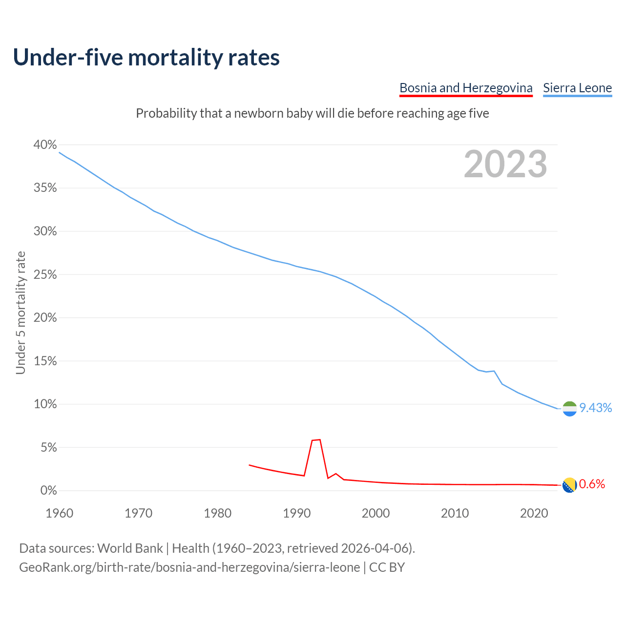 The chance that a newborn baby will die before reaching age five is 0.6% in Bosnia and Herzegovina and 9.43% in Sierra Leone. Above is a chart with historical data on under-five mortality rates.