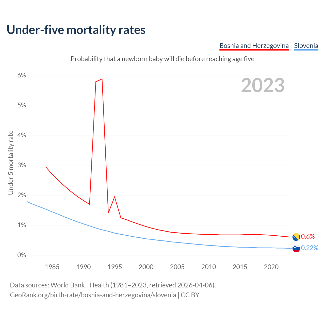 The chance that a newborn baby will die before reaching age five is 0.6% in Bosnia and Herzegovina and 0.22% in Slovenia. Above is a chart with historical data on under-five mortality rates.