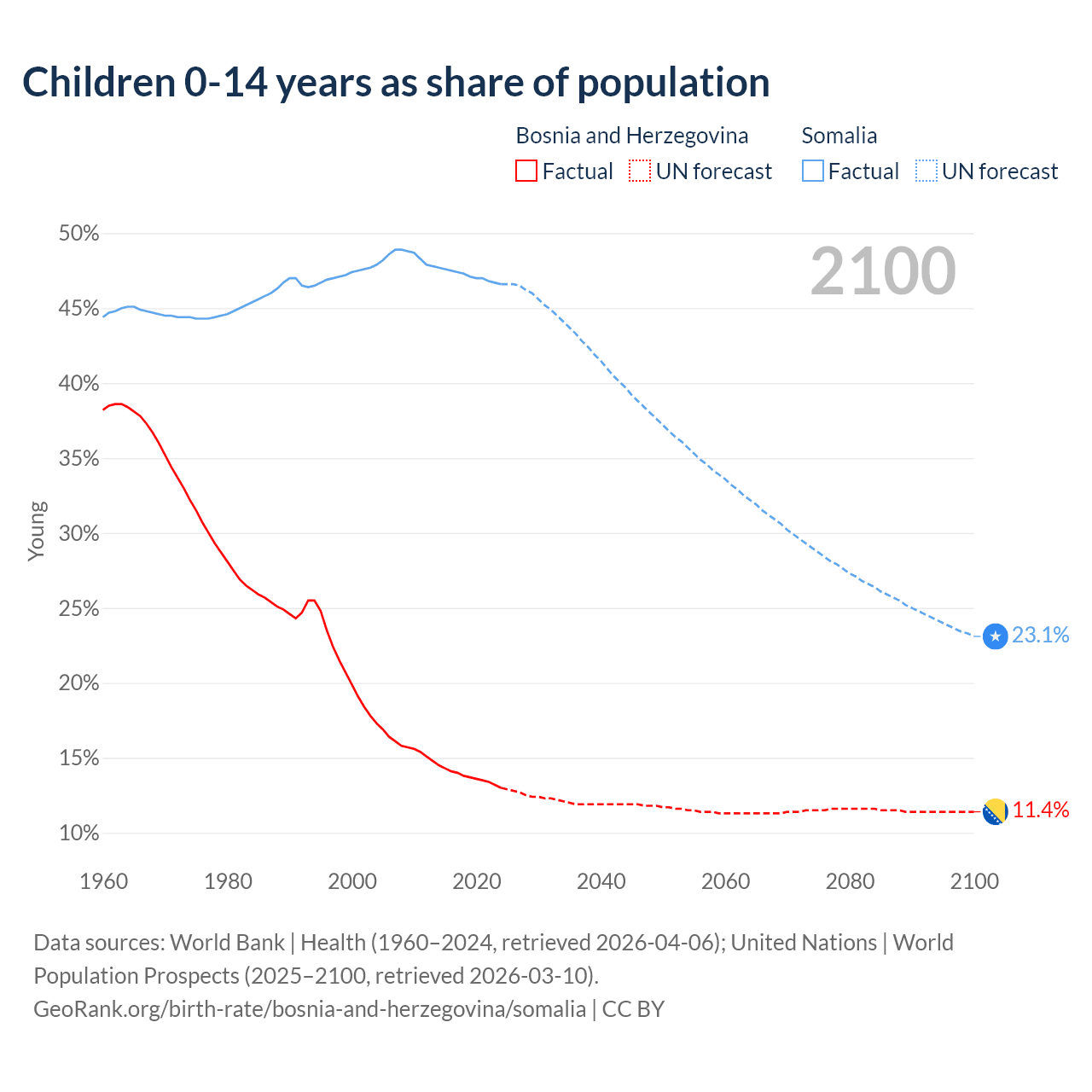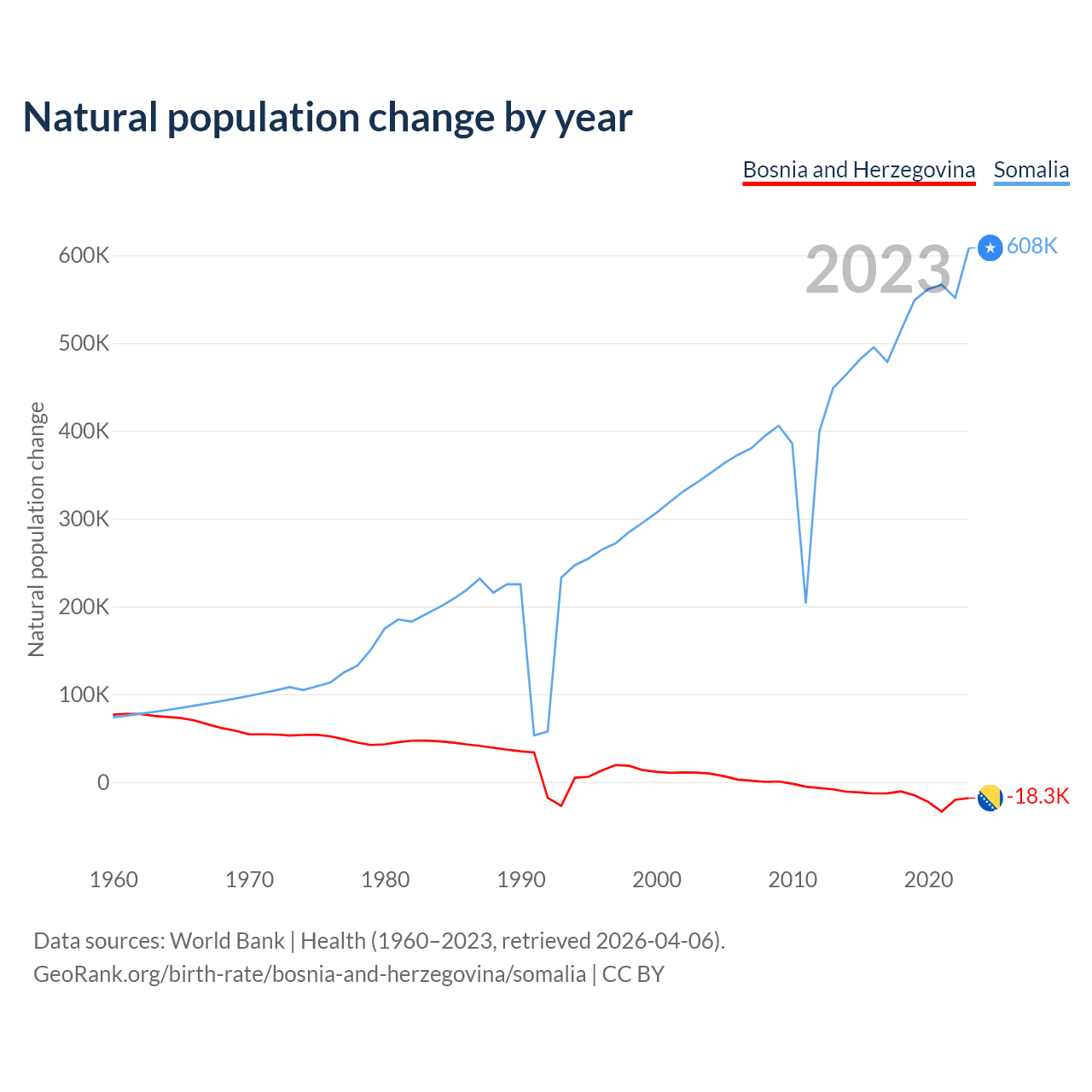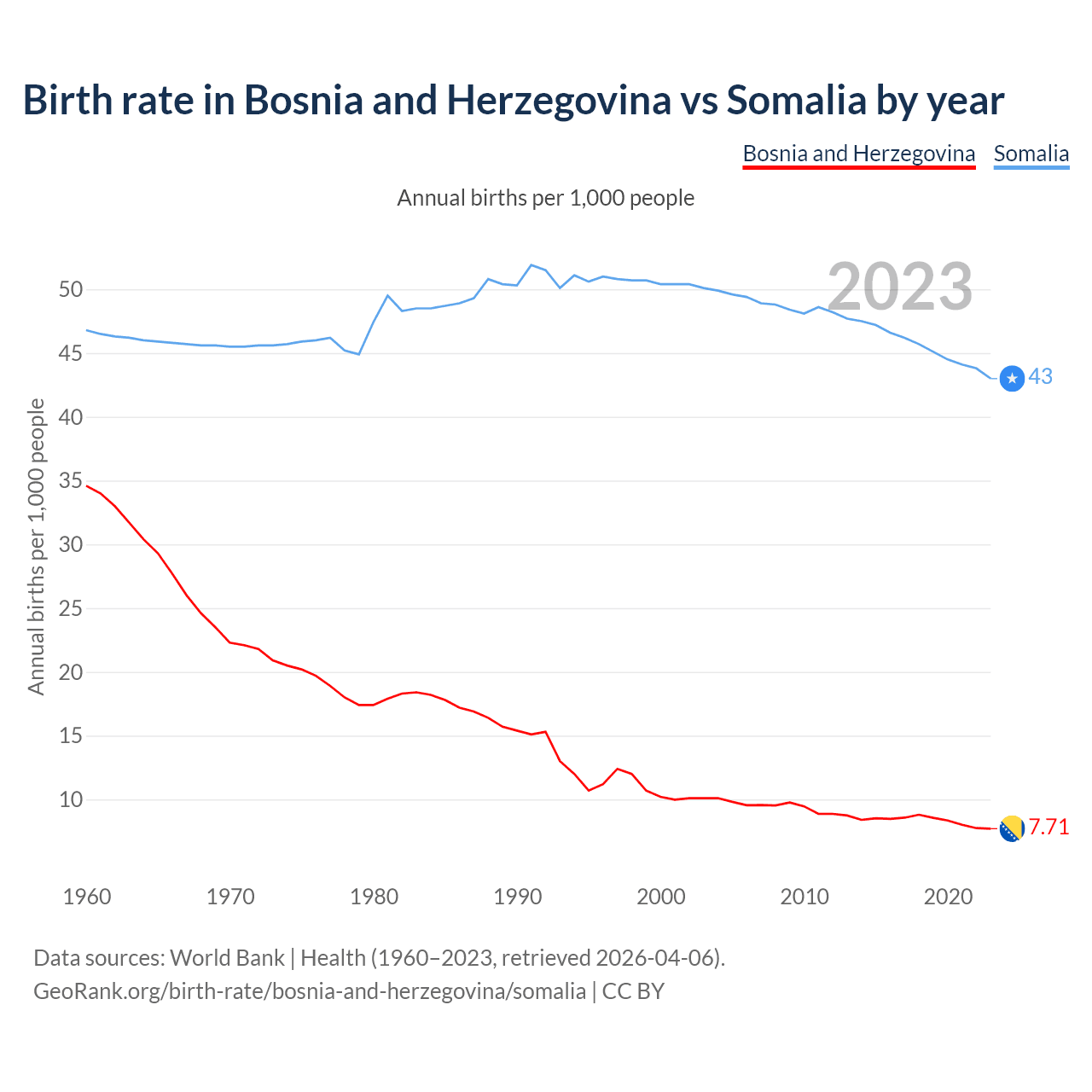 Bosnia and Herzegovina has an annual birth rate of 7.71 births per 1,000 people, compared to 43 for Somalia. The average number of children a woman is expected to have during her lifetime — the fertility rate, is 1.49 in Bosnia and Herzegovina and 6.13 in Somalia — 313% difference.