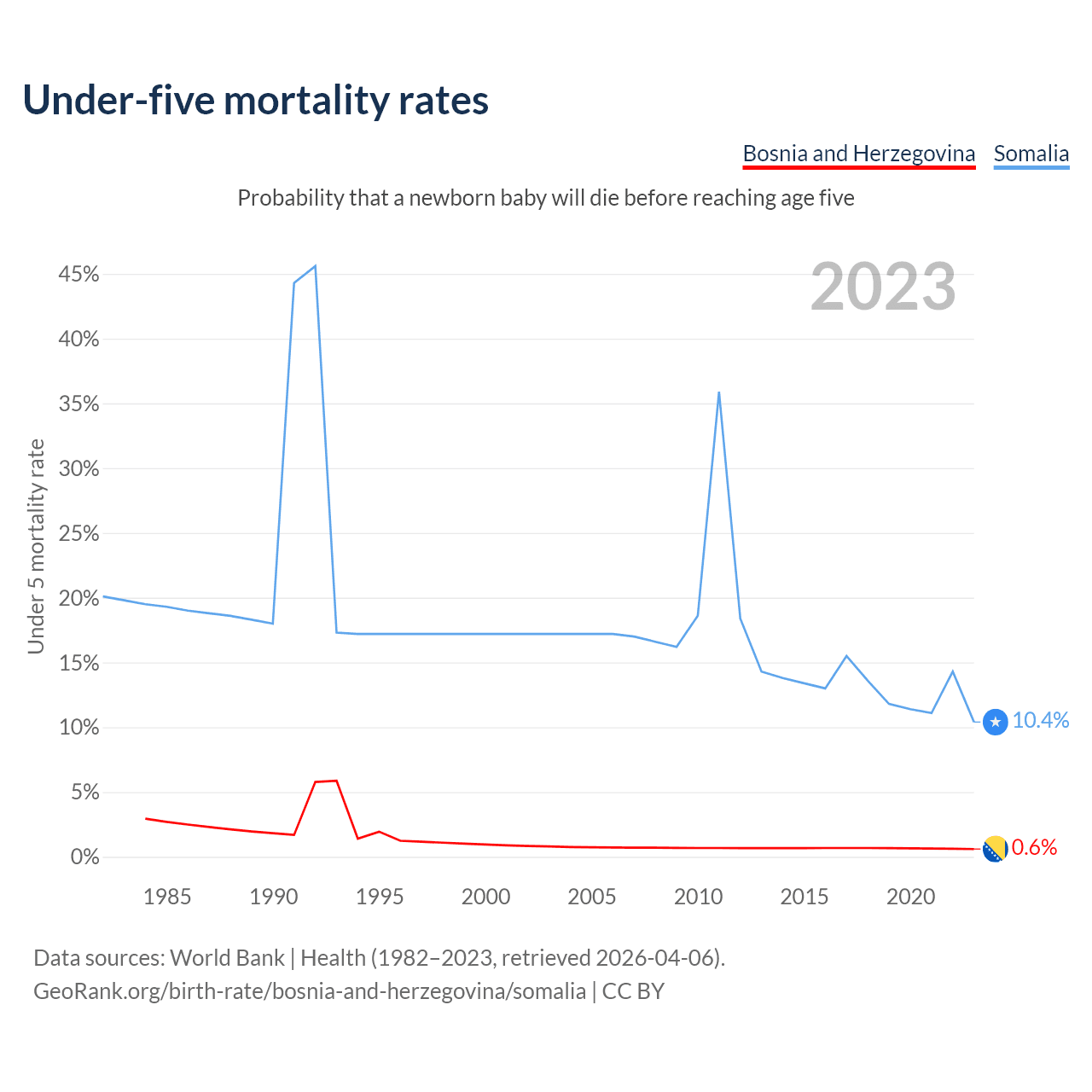 The chance that a newborn baby will die before reaching age five is 0.6% in Bosnia and Herzegovina and 10.4% in Somalia. Above is a chart with historical data on under-five mortality rates.