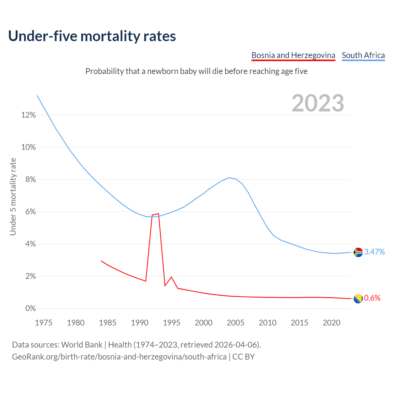 The chance that a newborn baby will die before reaching age five is 0.6% in Bosnia and Herzegovina and 3.47% in South Africa. Above is a chart with historical data on under-five mortality rates.