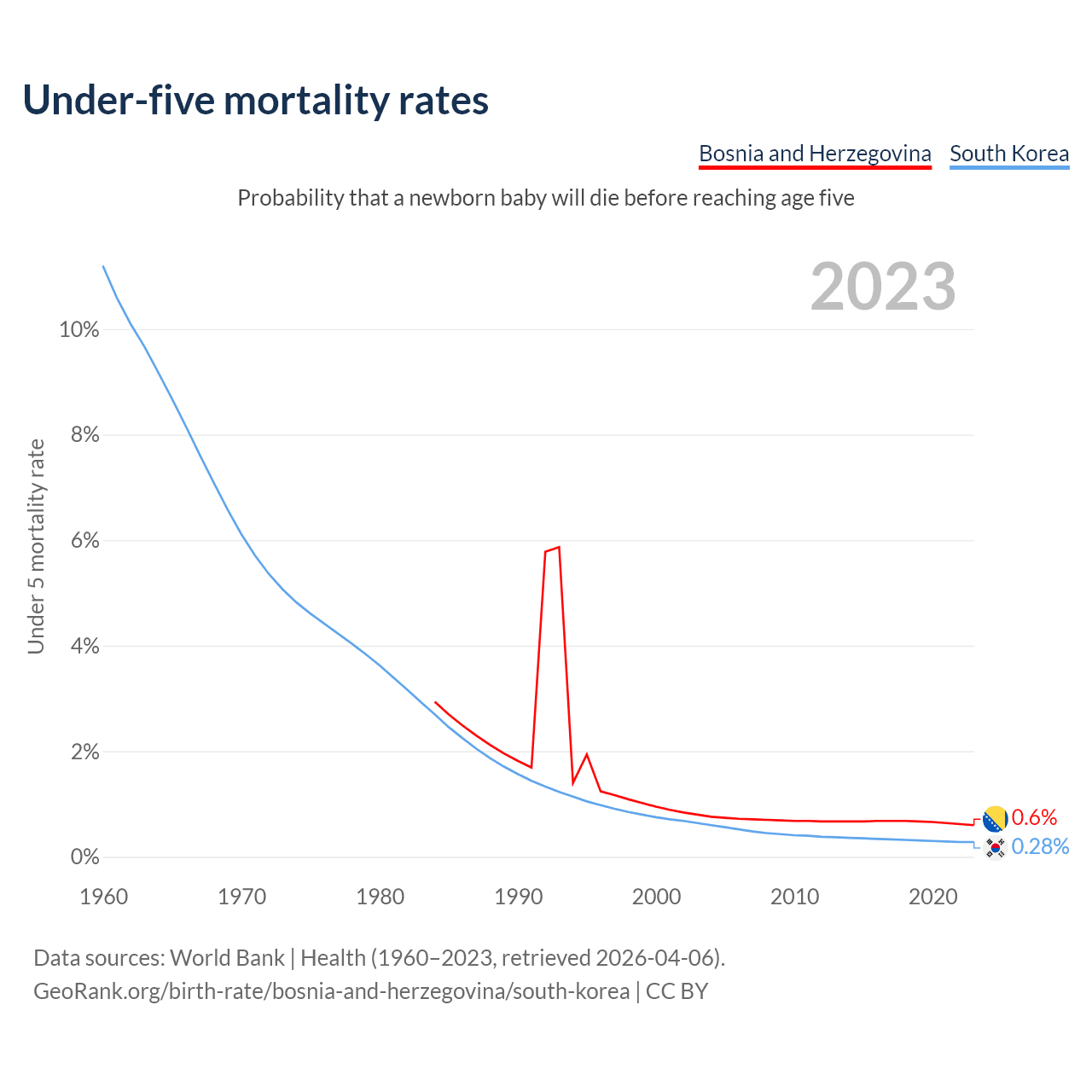 The chance that a newborn baby will die before reaching age five is 0.6% in Bosnia and Herzegovina and 0.28% in South Korea. Above is a chart with historical data on under-five mortality rates.