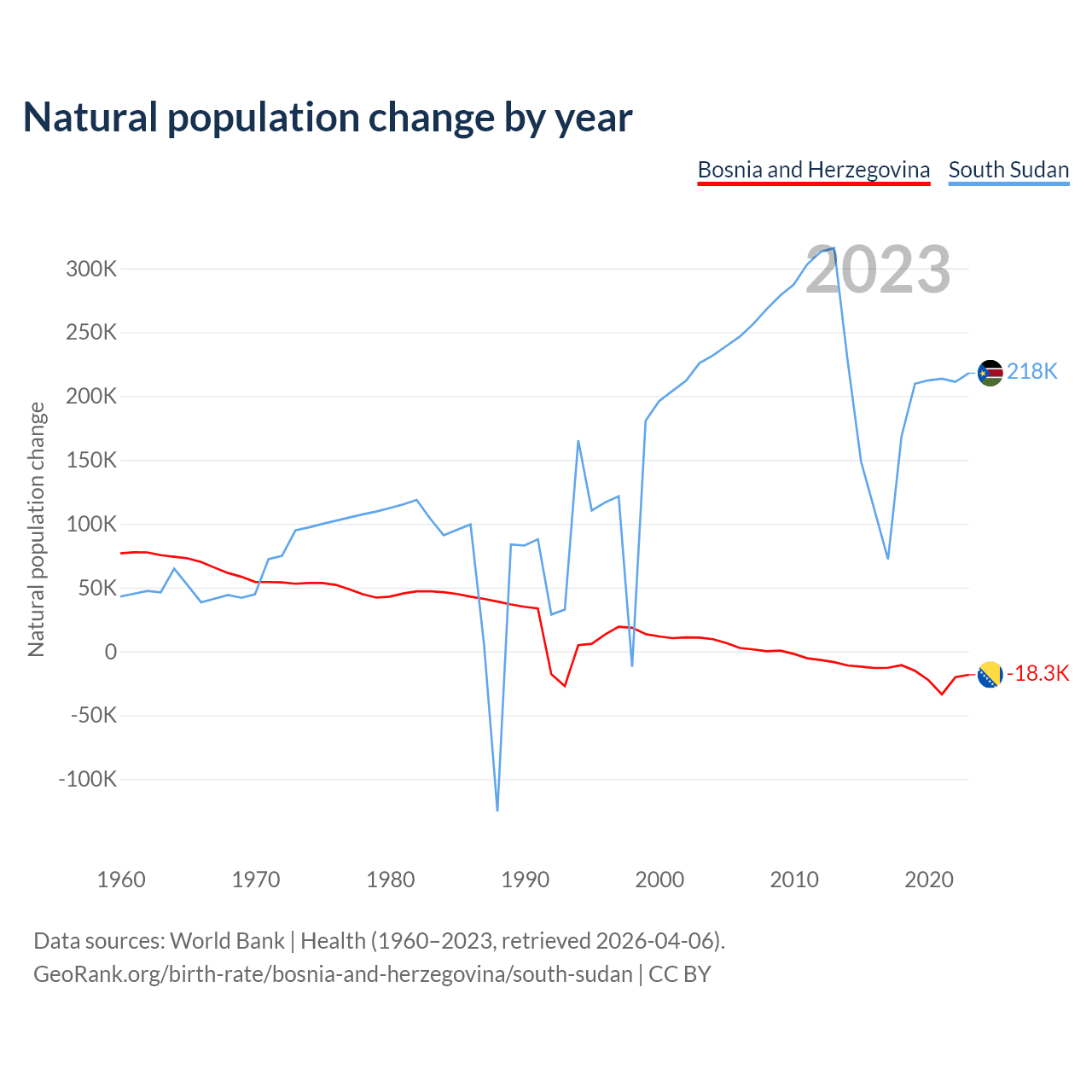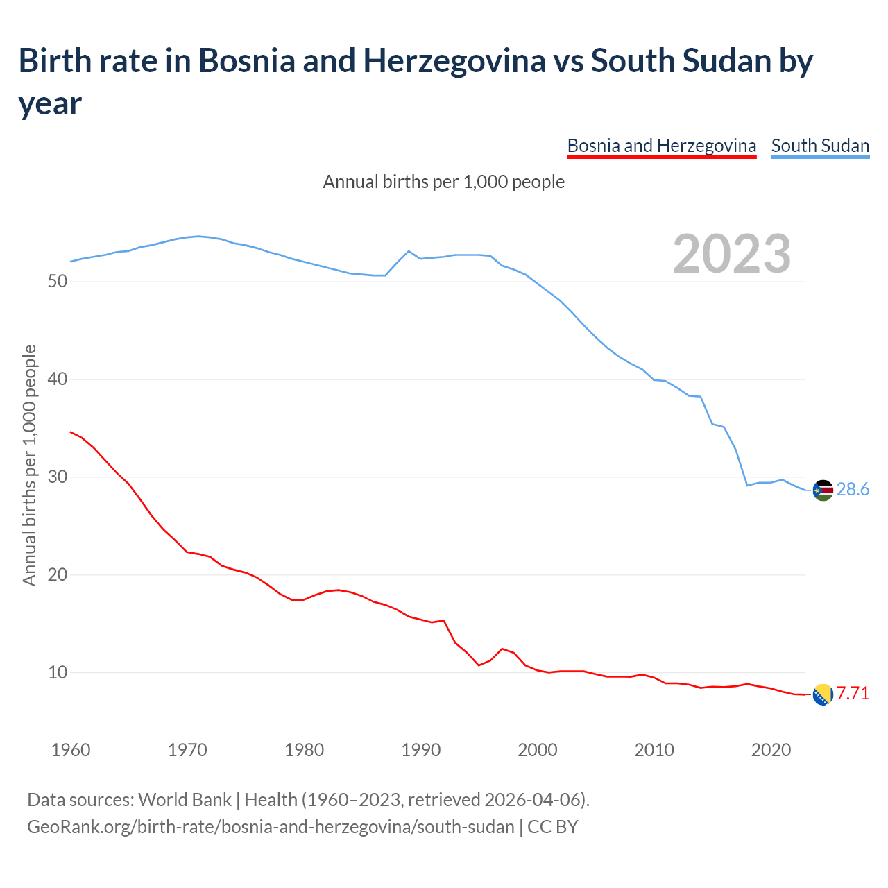 Bosnia and Herzegovina has an annual birth rate of 7.71 births per 1,000 people, compared to 28.6 for South Sudan. The average number of children a woman is expected to have during her lifetime — the fertility rate, is 1.49 in Bosnia and Herzegovina and 3.86 in South Sudan — 160% difference.