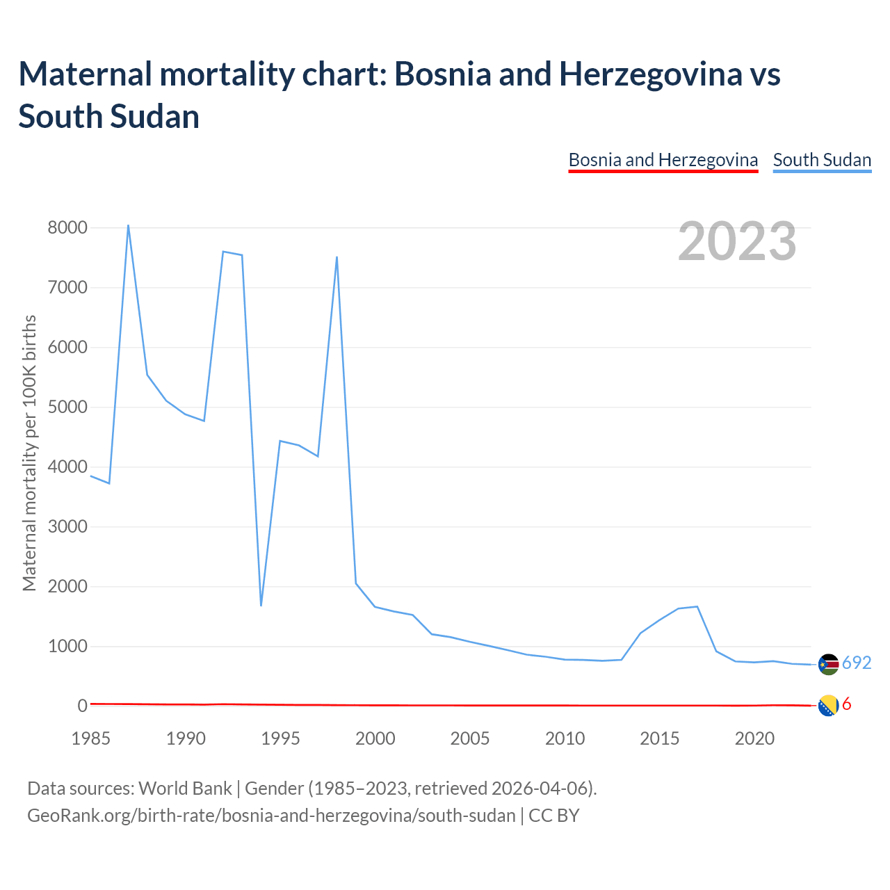 The maternal mortality rate, which is the probability of dying during childbirth or within 42 days of pregnancy termination, is 6 deaths per 100,000 live births in Bosnia and Herzegovina, compared to 692 deaths in South Sudan.