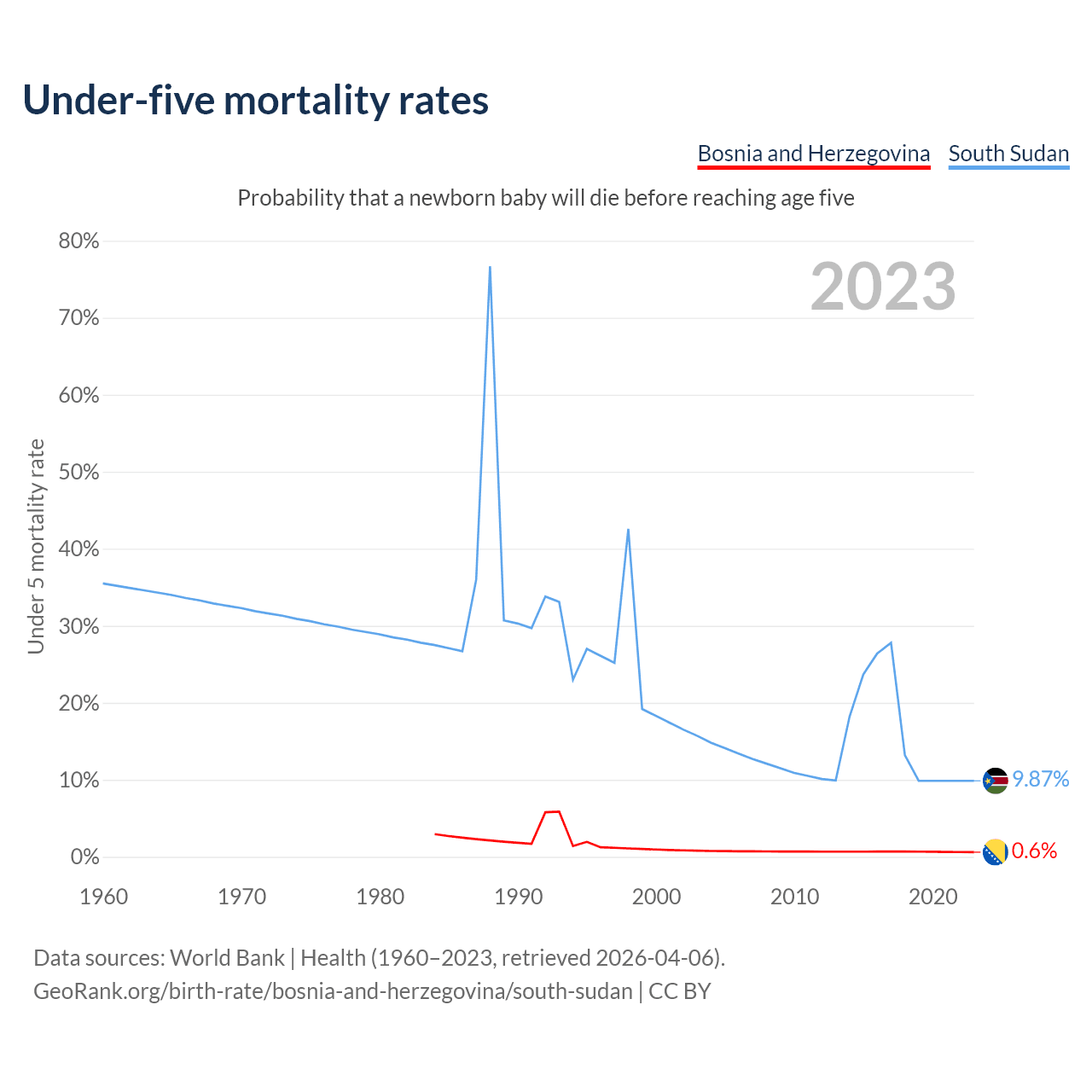 The chance that a newborn baby will die before reaching age five is 0.6% in Bosnia and Herzegovina and 9.87% in South Sudan. Above is a chart with historical data on under-five mortality rates.