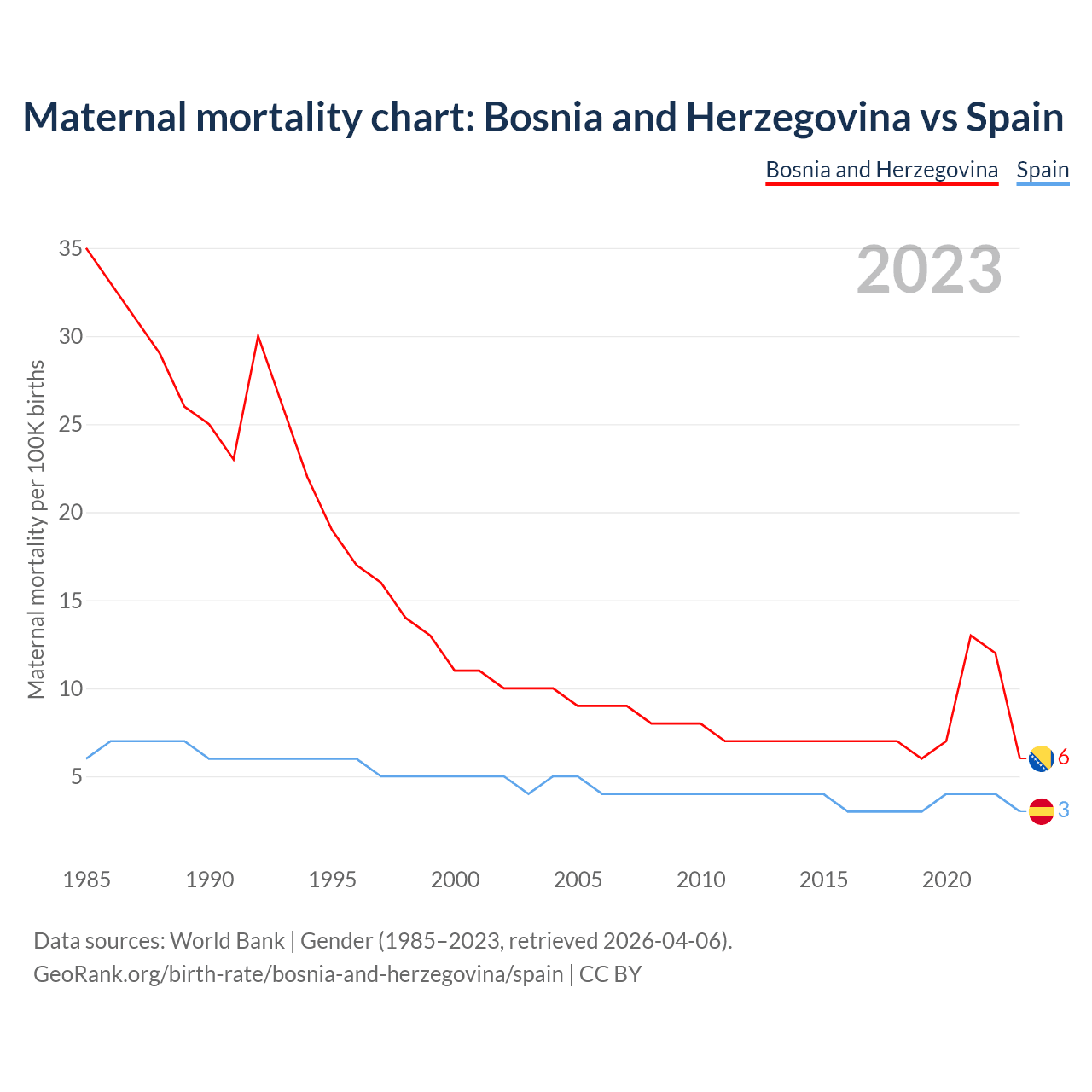 The maternal mortality rate, which is the probability of dying during childbirth or within 42 days of pregnancy termination, is 6 deaths per 100,000 live births in Bosnia and Herzegovina, compared to 3 deaths in Spain.