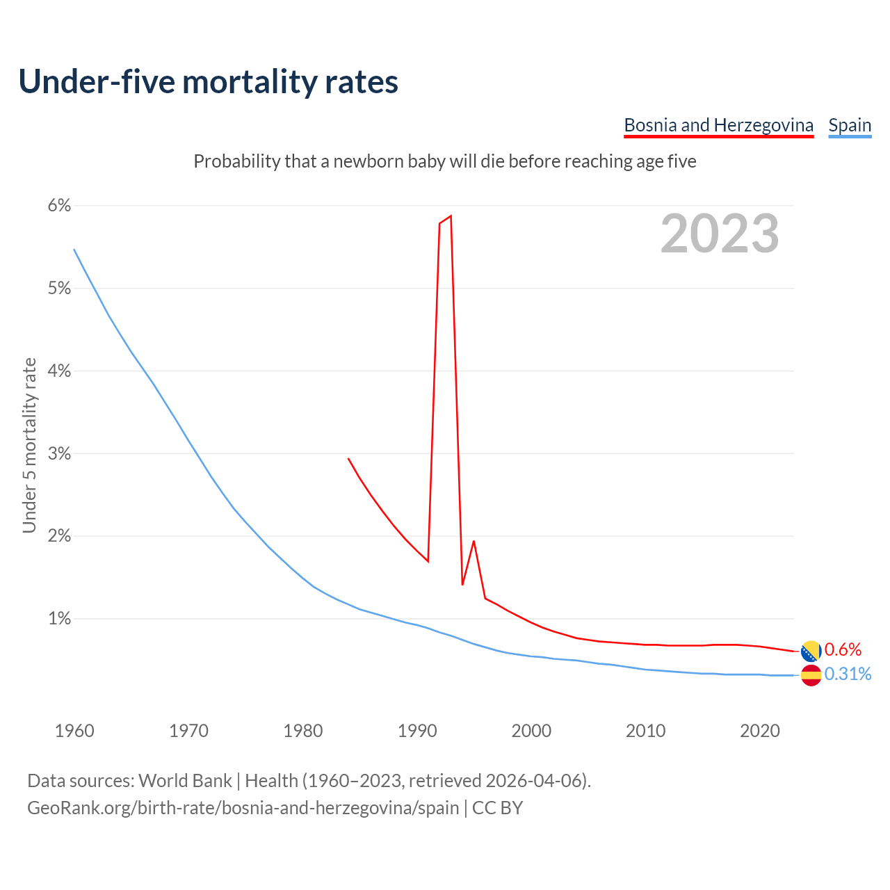 The chance that a newborn baby will die before reaching age five is 0.6% in Bosnia and Herzegovina and 0.31% in Spain. Above is a chart with historical data on under-five mortality rates.