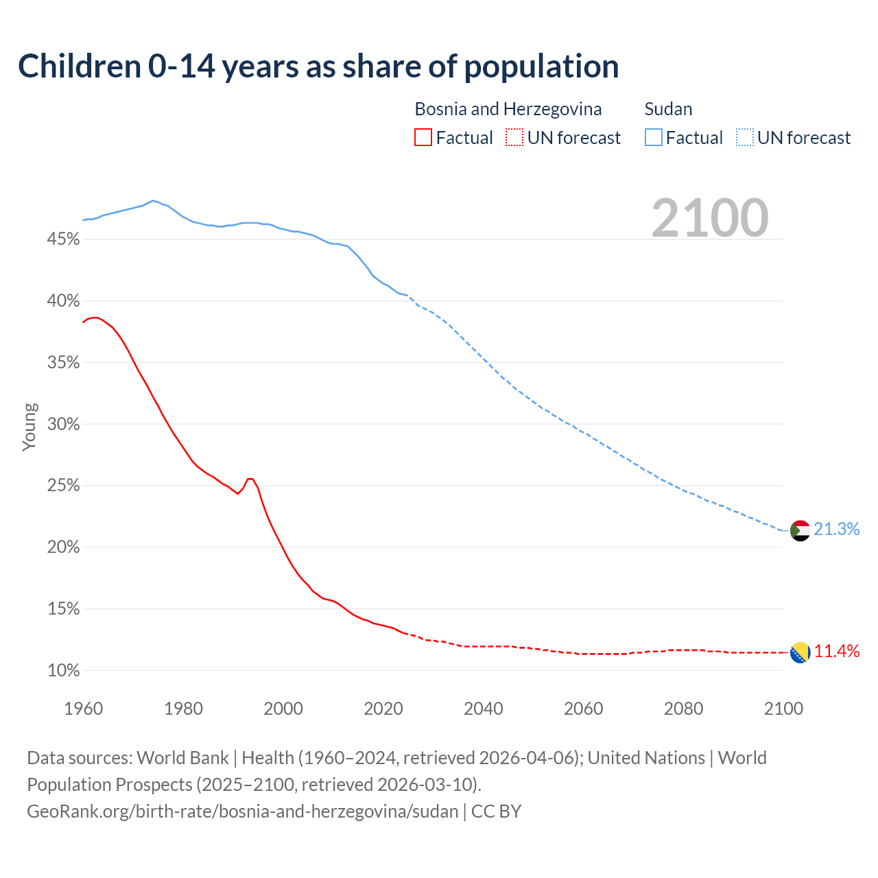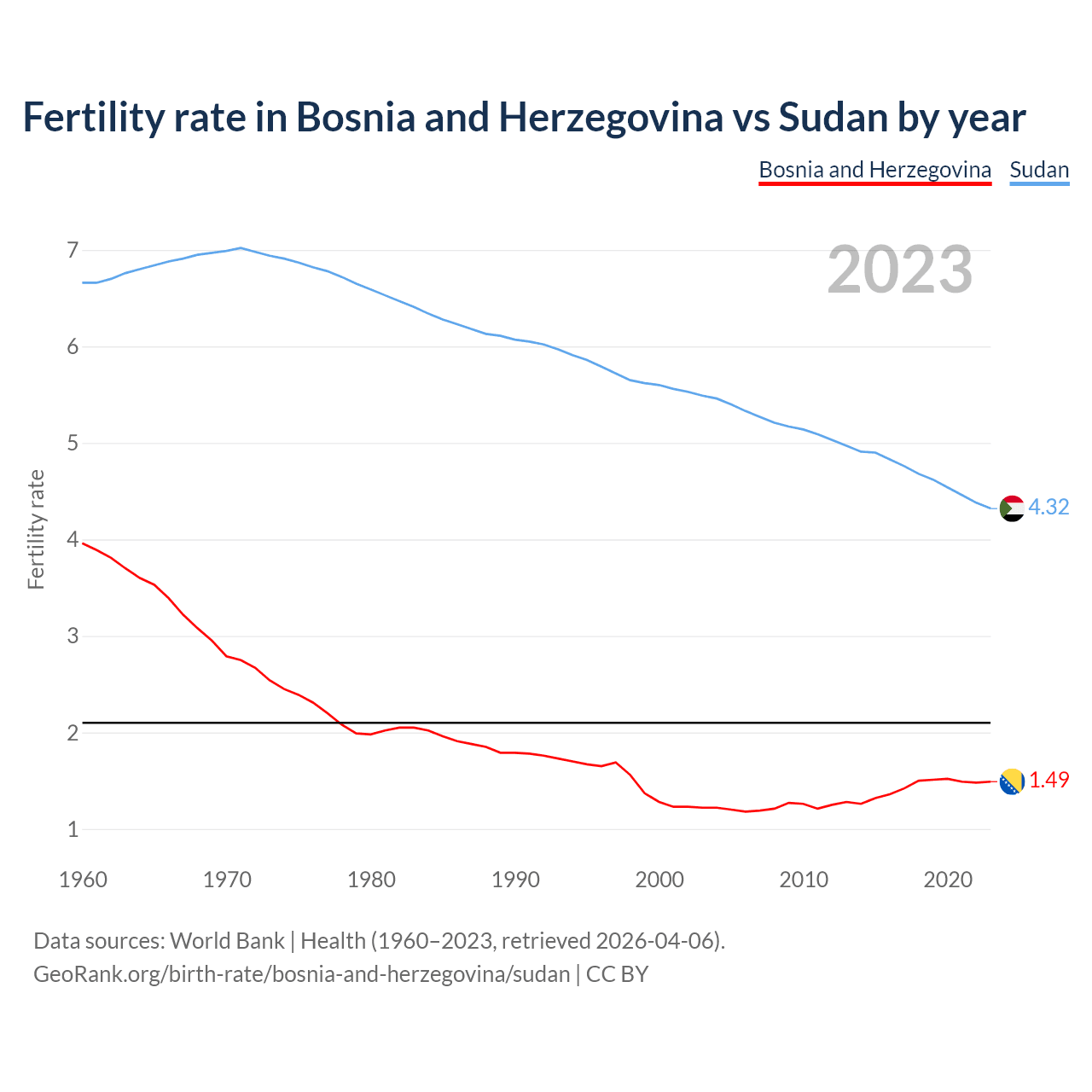 Bosnia and Herzegovina has an annual birth rate of 7.71 births per 1,000 people, compared to 33.6 for Sudan. The average number of children a woman is expected to have during her lifetime — the fertility rate, is 1.49 in Bosnia and Herzegovina and 4.32 in Sudan — 190.9% difference.