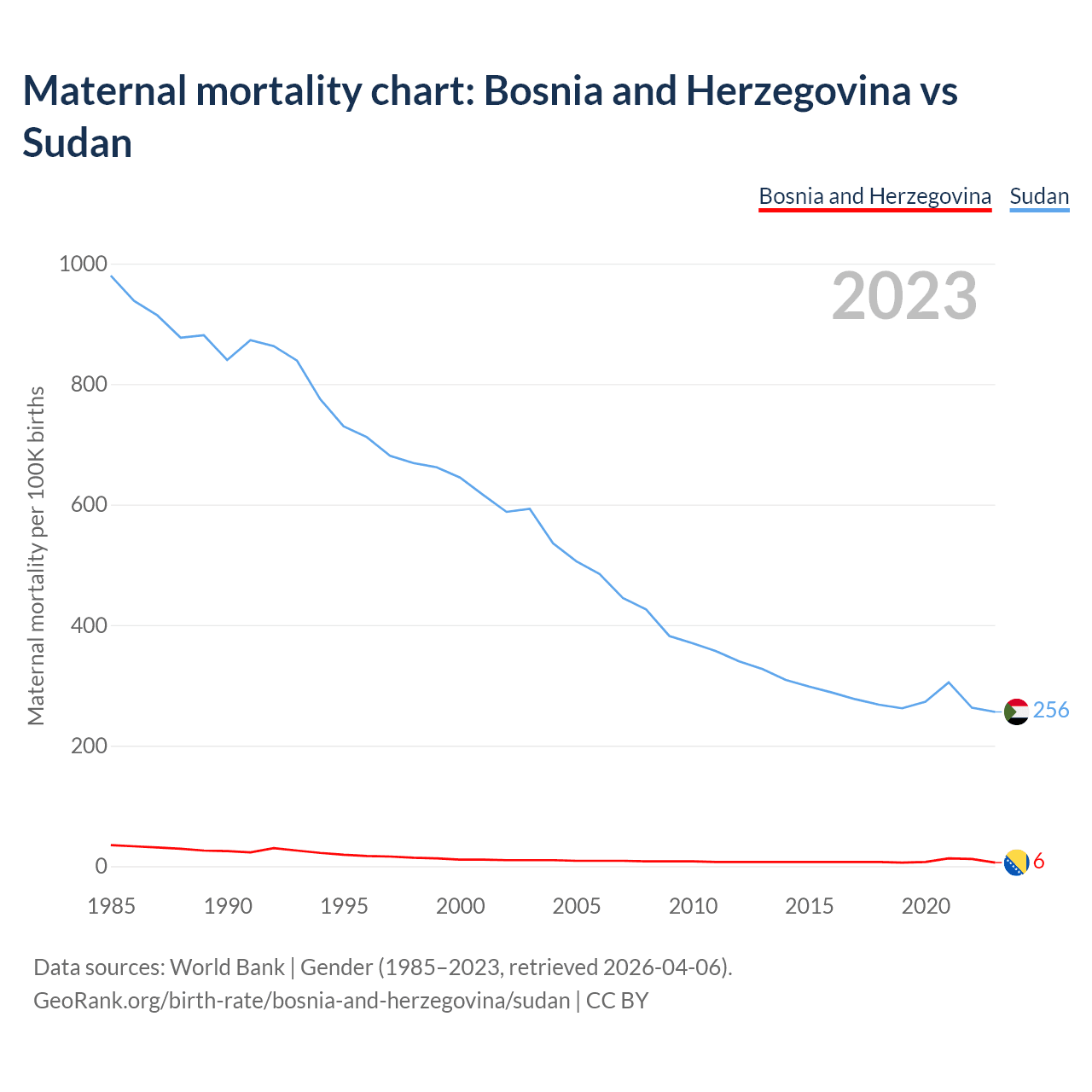 The maternal mortality rate, which is the probability of dying during childbirth or within 42 days of pregnancy termination, is 6 deaths per 100,000 live births in Bosnia and Herzegovina, compared to 256 deaths in Sudan.