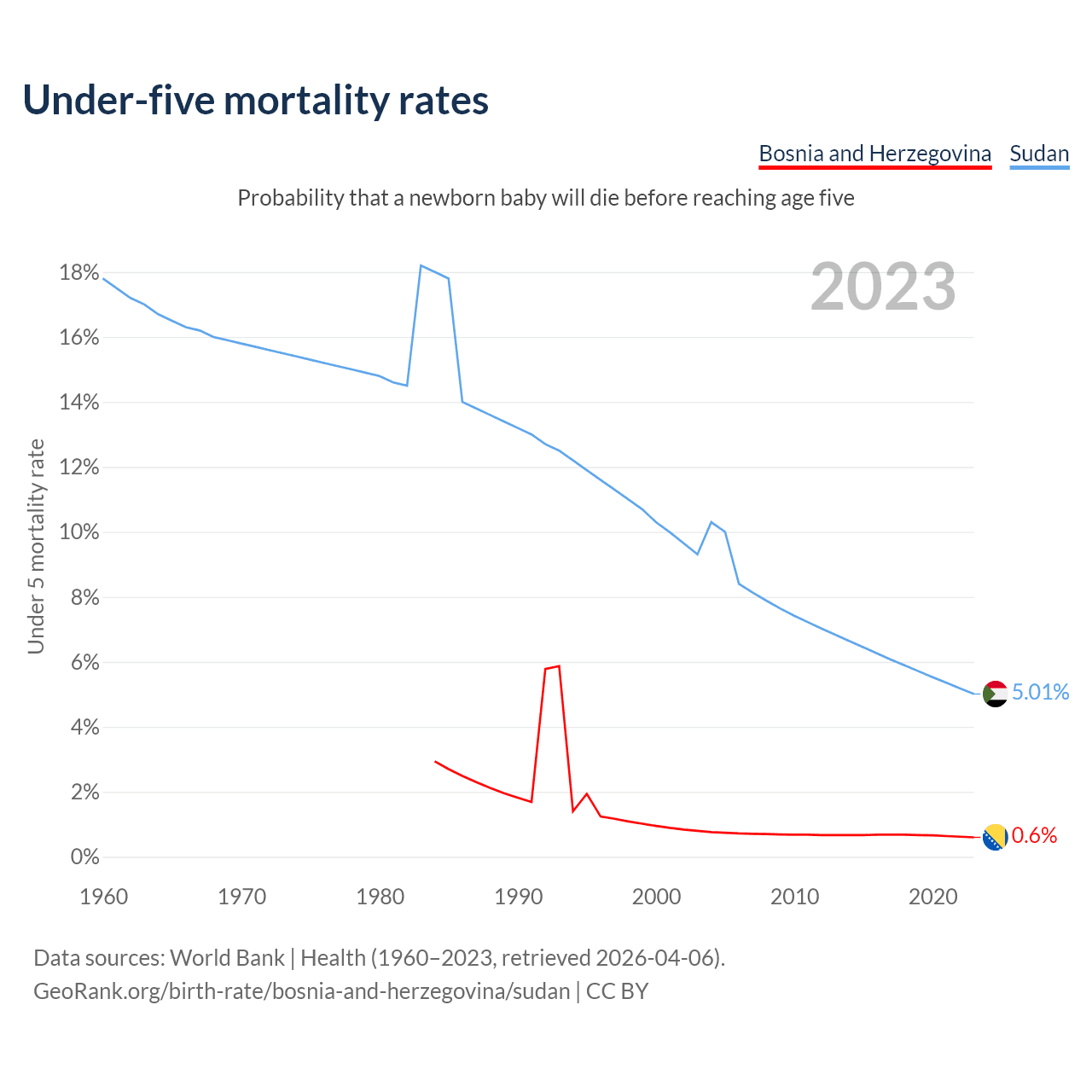 The chance that a newborn baby will die before reaching age five is 0.6% in Bosnia and Herzegovina and 5.01% in Sudan. Above is a chart with historical data on under-five mortality rates.