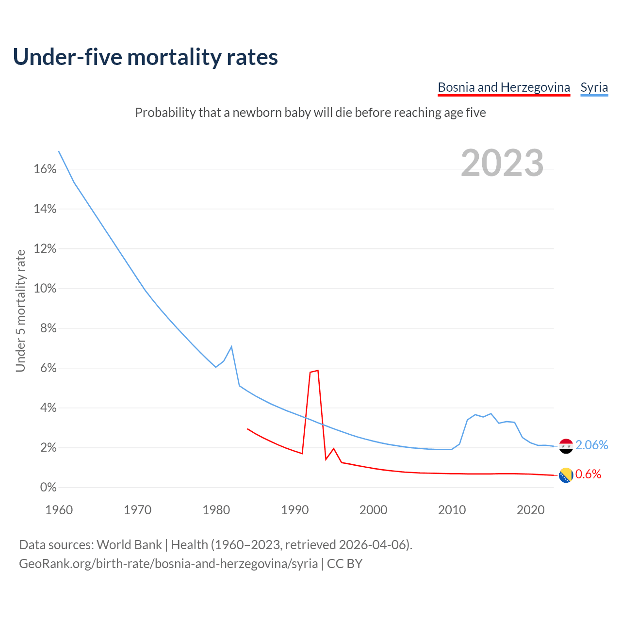 The chance that a newborn baby will die before reaching age five is 0.6% in Bosnia and Herzegovina and 2.06% in Syria. Above is a chart with historical data on under-five mortality rates.