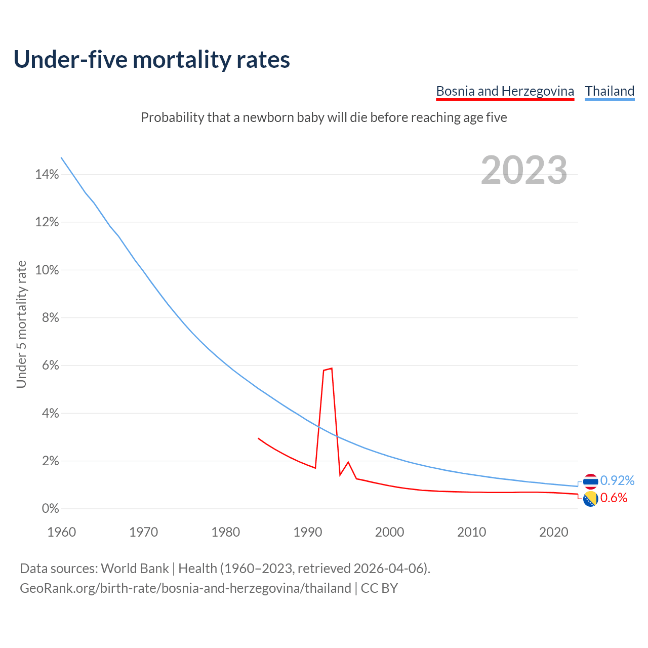 The chance that a newborn baby will die before reaching age five is 0.6% in Bosnia and Herzegovina and 0.92% in Thailand. Above is a chart with historical data on under-five mortality rates.