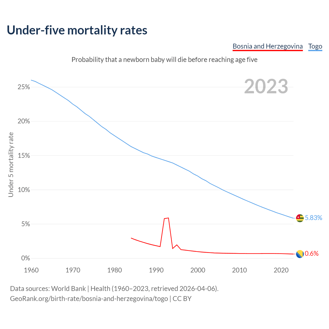 The chance that a newborn baby will die before reaching age five is 0.6% in Bosnia and Herzegovina and 5.83% in Togo. Above is a chart with historical data on under-five mortality rates.