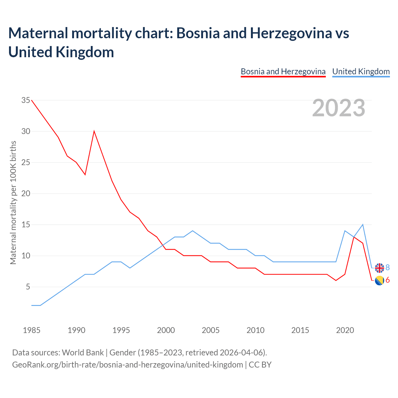 The maternal mortality rate, which is the probability of dying during childbirth or within 42 days of pregnancy termination, is 6 deaths per 100,000 live births in Bosnia and Herzegovina, compared to 8 deaths in the United Kingdom.